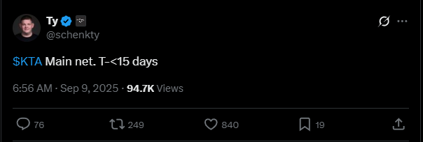 The countdown is on, and the crypto space is watching closely. On September 9, Keeta Network founder Ty Schenk confirmed that mainnet is less than 15 days away. That announcement, which quickly spread through social channels, set a definitive timeline for one of the most anticipated launches of 2025.