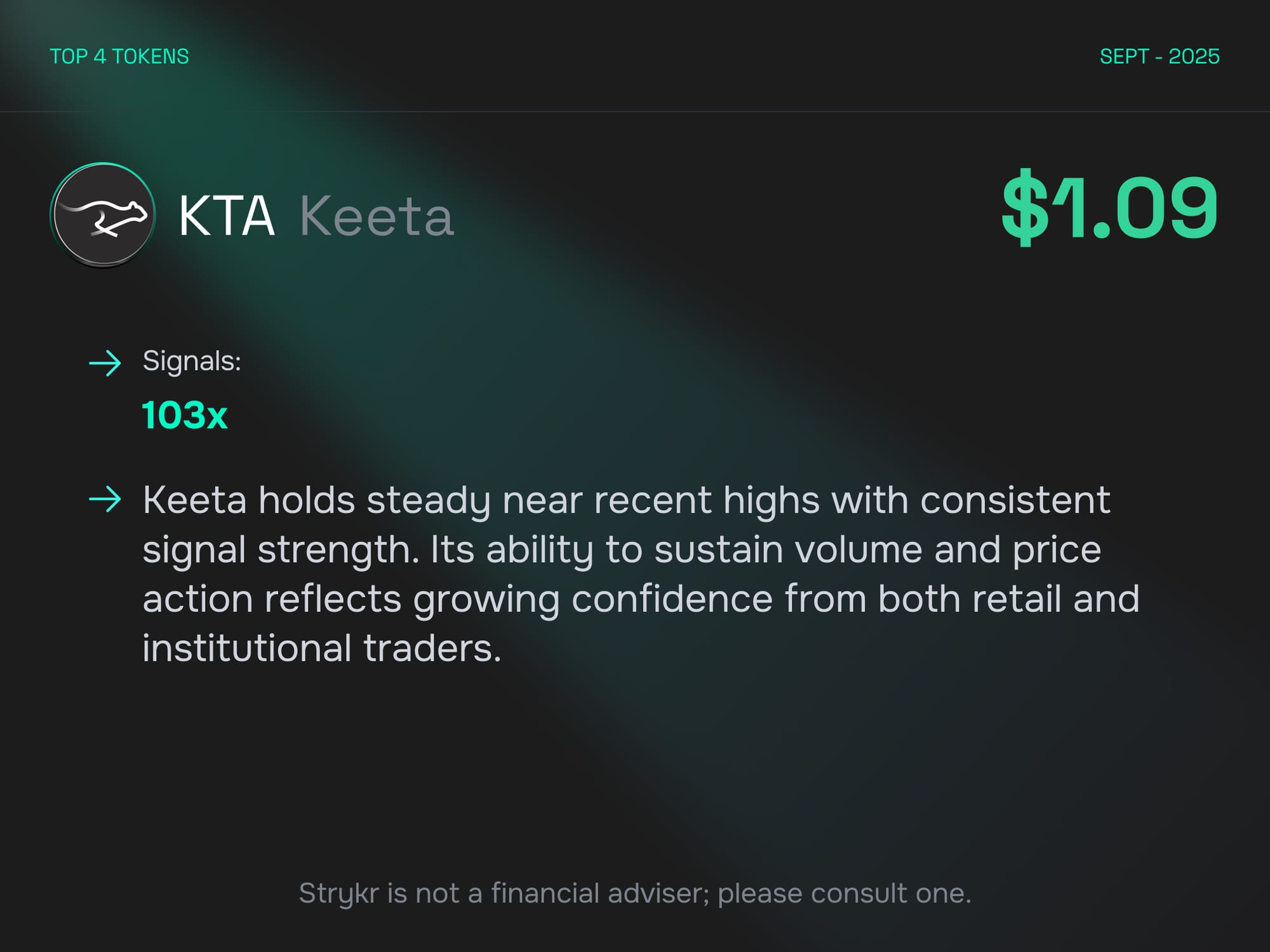 Keeta held firm near recent highs, reflecting steady confidence from both retail and institutional desks. Signal strength above 100x reinforced its staying power as a mid-cap with real adoption traction. KTA’s momentum is tied not just to speculative activity but also to ongoing liquidity expansion and exchange depth. Its ability to sustain volume while preserving price structure makes it one of the more balanced bullish bets. If broader risk appetite holds, Keeta could cement itself as a recurring core play for active traders.