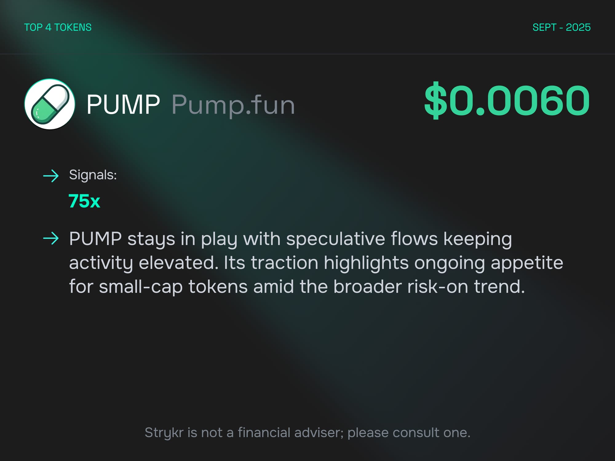PUMP retained its spot as Solana’s speculative heartbeat. Despite cooling slightly from recent highs, it maintained heavy engagement with 75x signals. This reflects an ongoing appetite for high-beta exposure, where traders seek short bursts of volatility. PUMP’s consistency in topping activity charts highlights its role as a community-driven liquidity magnet. While inherently risky, its traction shows no signs of fading, keeping it central to momentum-based strategies in the near term.