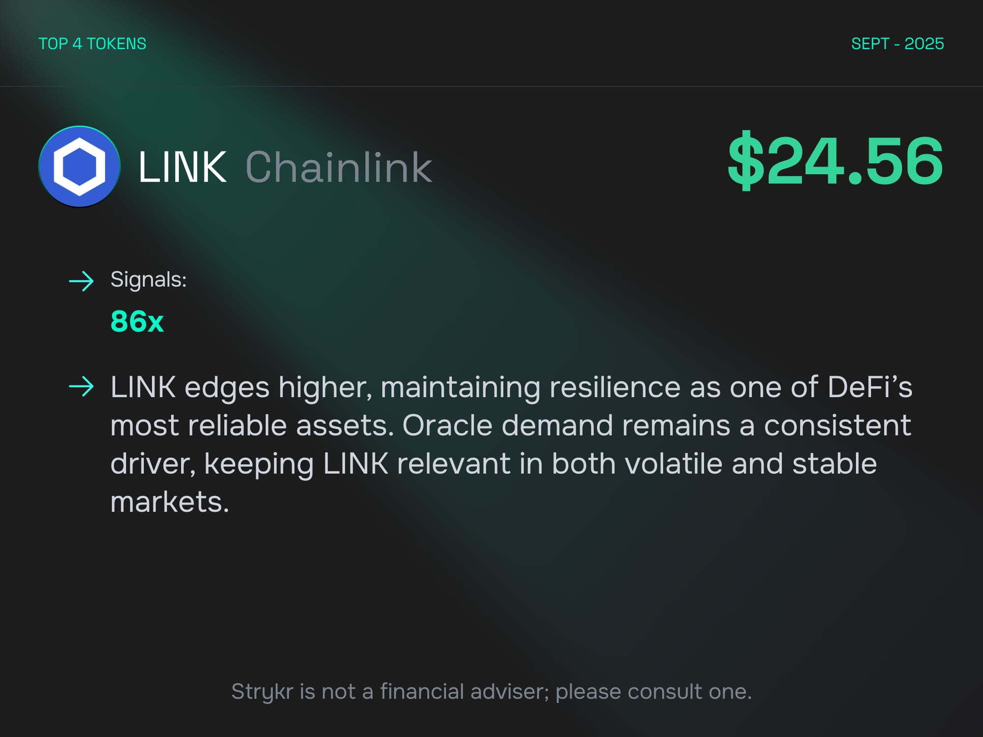 LINK edged higher, reinforcing its position as one of DeFi’s most resilient tokens. Oracle demand continues to support its long-term structure, making it both a speculative and fundamental play. With 86x signals, activity was widespread, showing persistent institutional usage alongside retail flows. LINK’s ability to weather volatility while holding a growth trajectory strengthens its reputation as an anchor within DeFi. In weeks when traders seek stability without sacrificing upside, LINK remains a top-tier candidate.