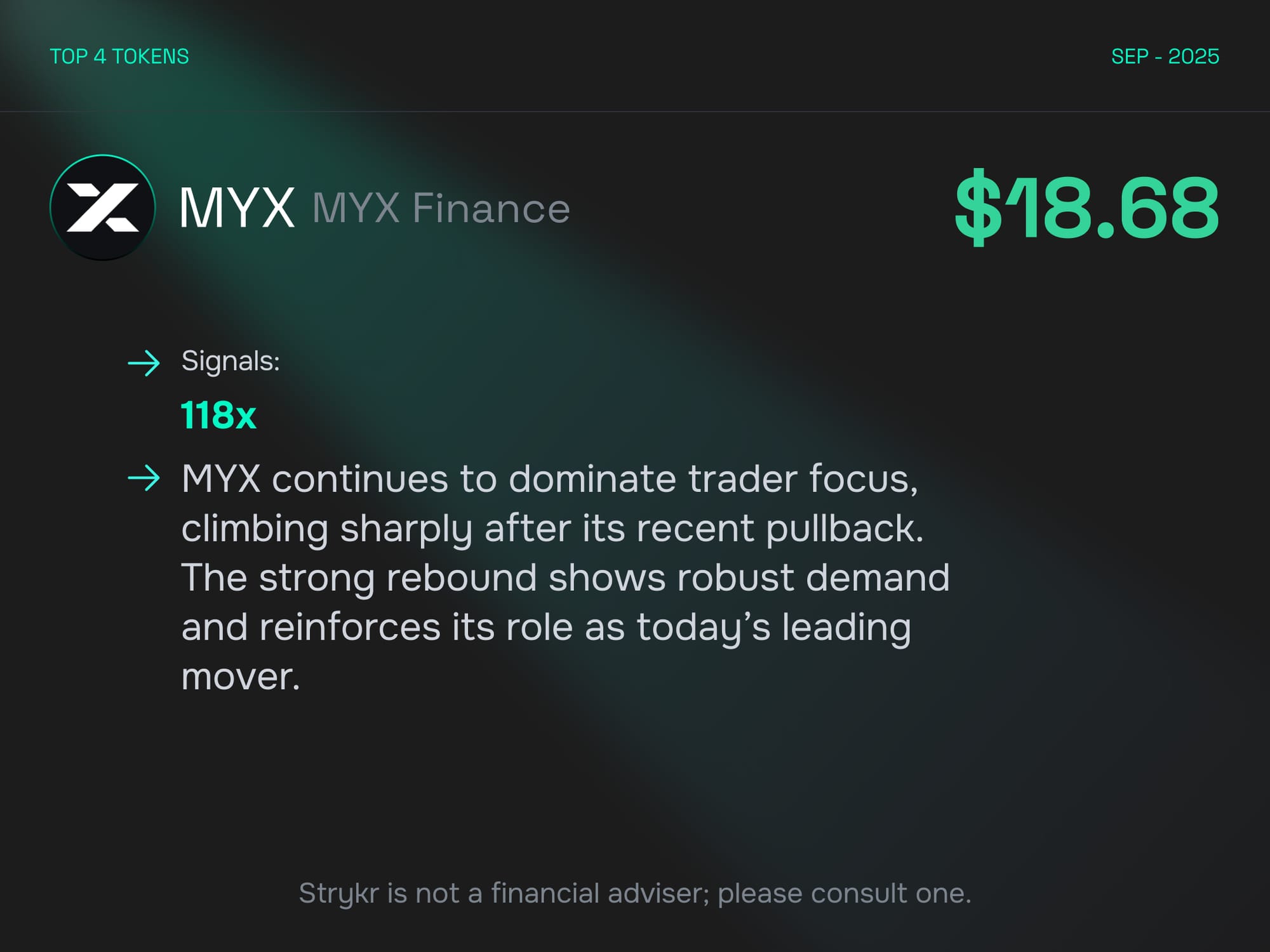 MYX continued its commanding run, rebounding sharply after its recent pullback. The strong rally underscores robust demand, positioning MYX as the week’s most active leader. High signal activity reflects both institutional traders recalibrating exposure and retail momentum chasing. The ability to climb back with conviction highlights MYX’s relevance as one of the cycle’s flagship movers. Sustained volume suggests this is more than a one-off rebound, with traders treating MYX as a structural barometer for alt sentiment.