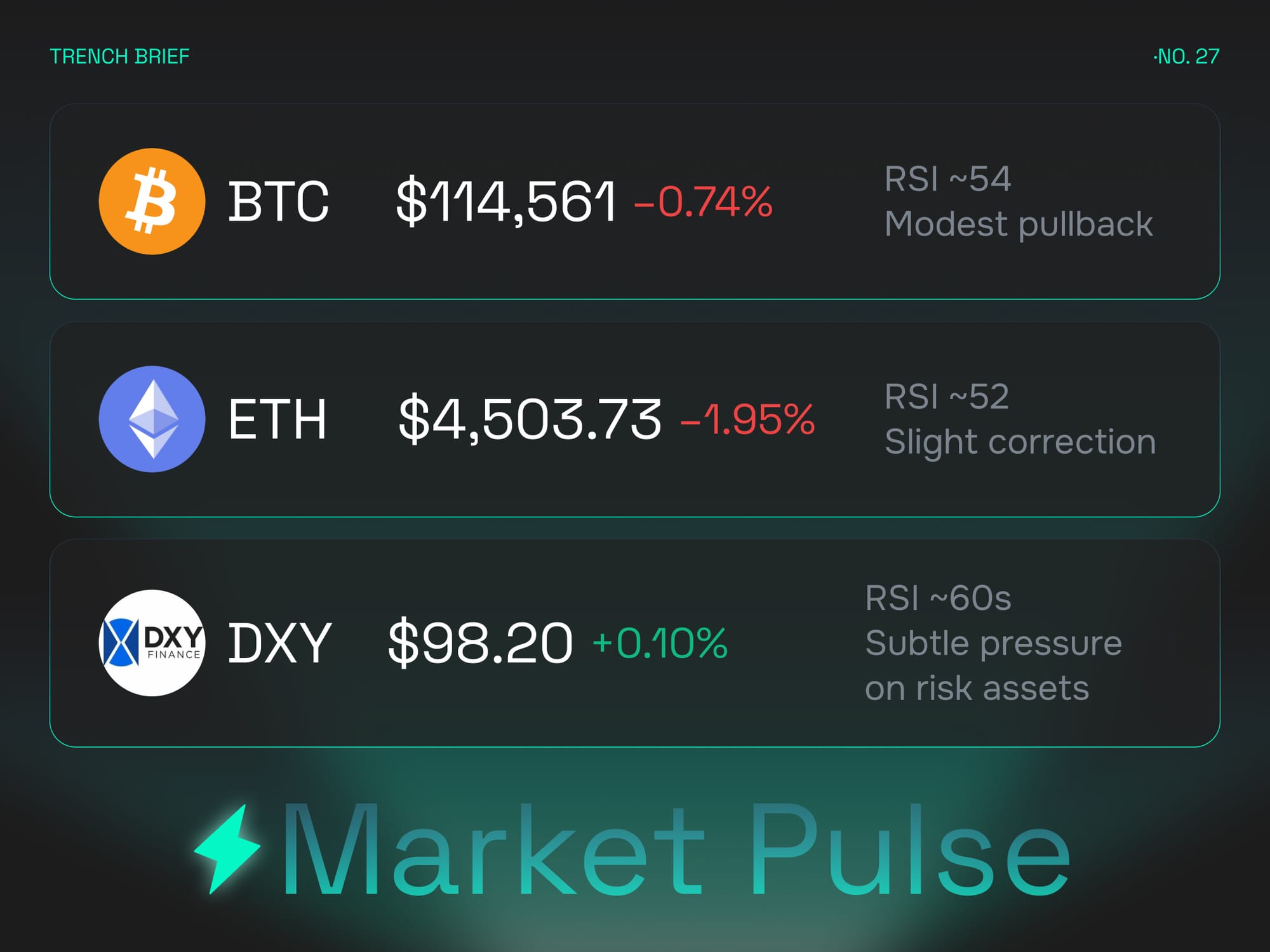 Markets are opening the week with a slight reset after last week’s rally. Bitcoin slipped back to $114,561 (-0.74%) with RSI near 54, marking a modest pullback rather than a structural shift. ETH tracked lower as well, trading at $4,503 (-1.95%) with RSI at 52, signaling a cooling period but still holding higher ground relative to earlier ranges. The Dollar Index (DXY) edged up to $98.20 (+0.10%) with RSI in the 60s, showing that the dollar remains firm and is applying subtle pressure to risk assets across the board.