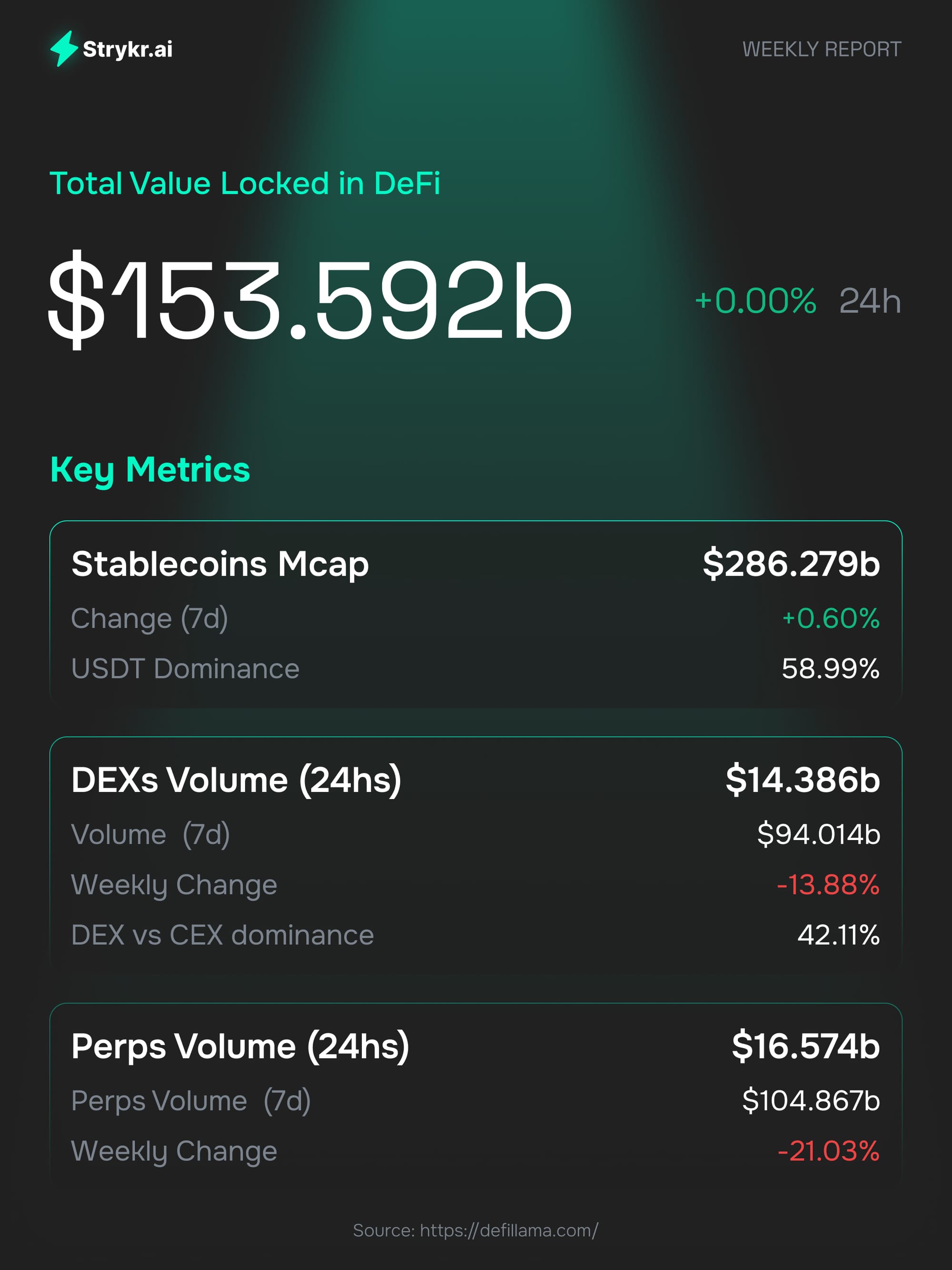 DeFi showed resilience even as volumes fluctuated. Total value locked remained near $153.6B, with stablecoin market cap at $286B and USDT dominance just under 59%. DEX activity slipped by almost 14%, but perps volumes declined further, down 21%. Despite softer week-over-week activity, leading protocols like Lido, Aave, and EigenLayer continued generating meaningful fee revenue, underscoring sticky demand for liquid staking and lending.