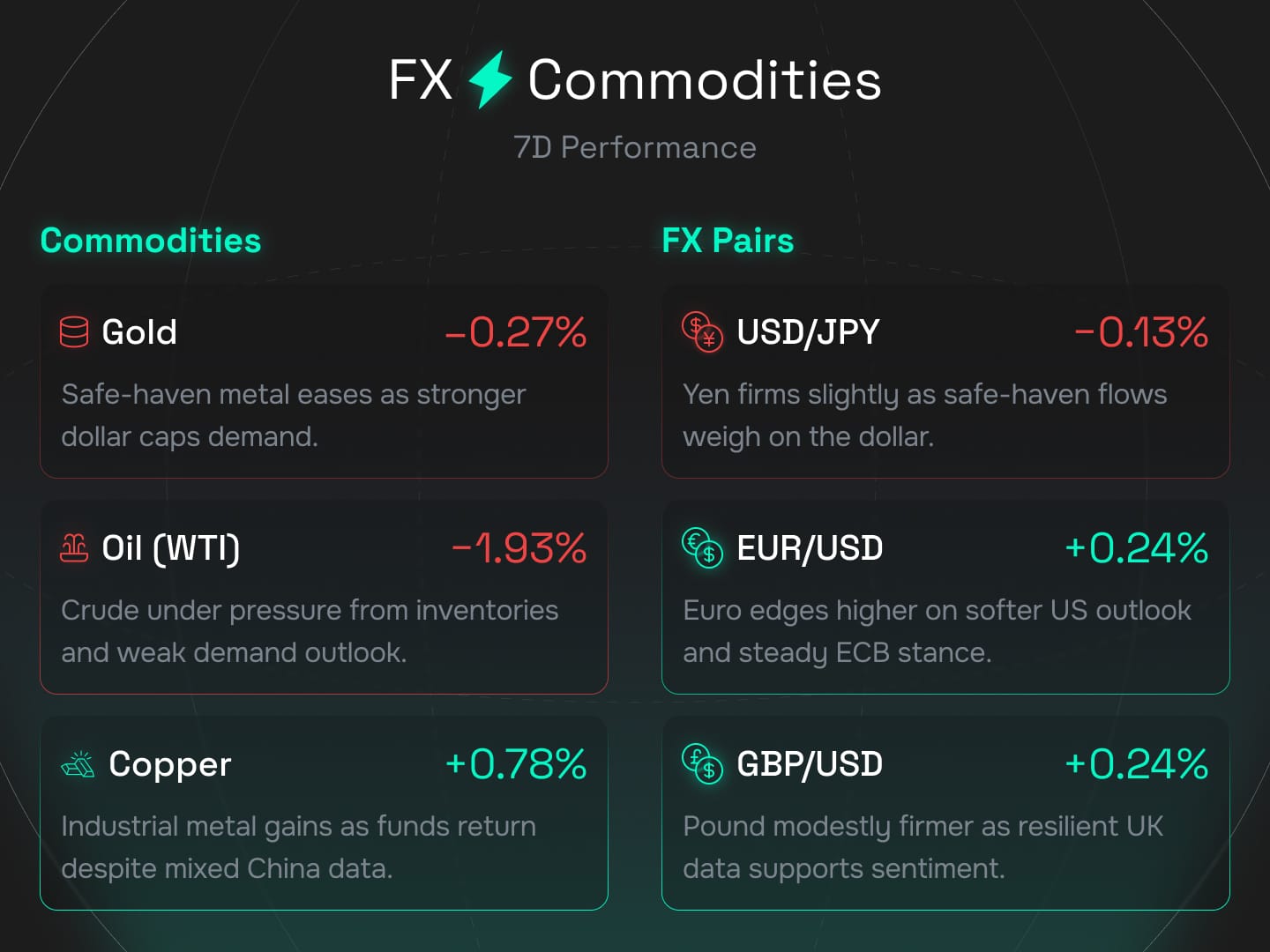 Cross-asset performance showed mixed dynamics. Gold slipped 0.27% as dollar firmness capped safe-haven demand, while oil fell nearly 2% under pressure from inventory builds and weaker demand outlook. Copper gained 0.78%, reflecting modest optimism in industrial flows despite mixed China data.