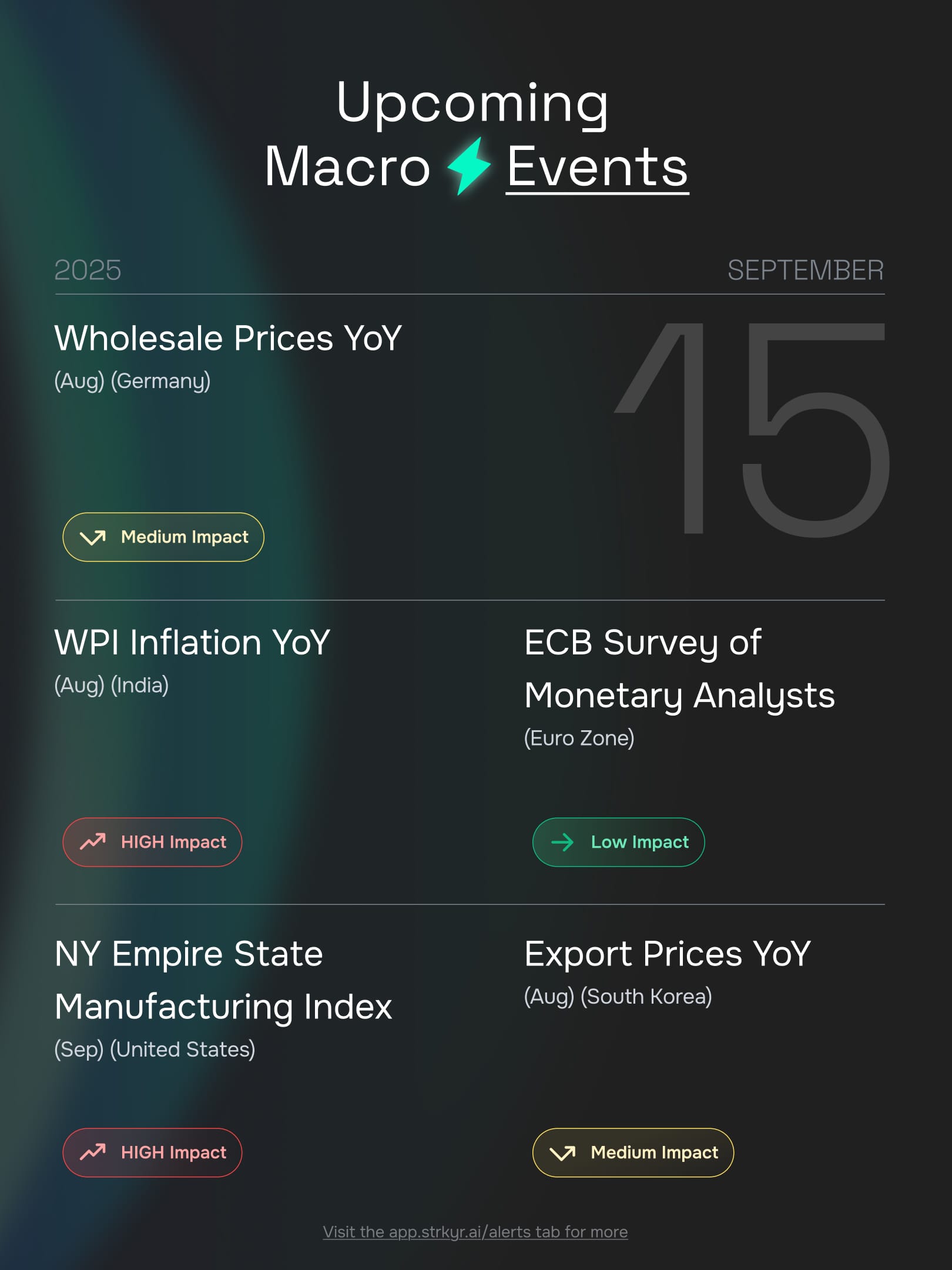- Monday (Sept 15): Germany’s Wholesale Prices and India’s WPI Inflation will set the early tone. Softer readings would validate last week’s trend of easing price pressures, but any surprise uptick risks reviving hawkish narratives.