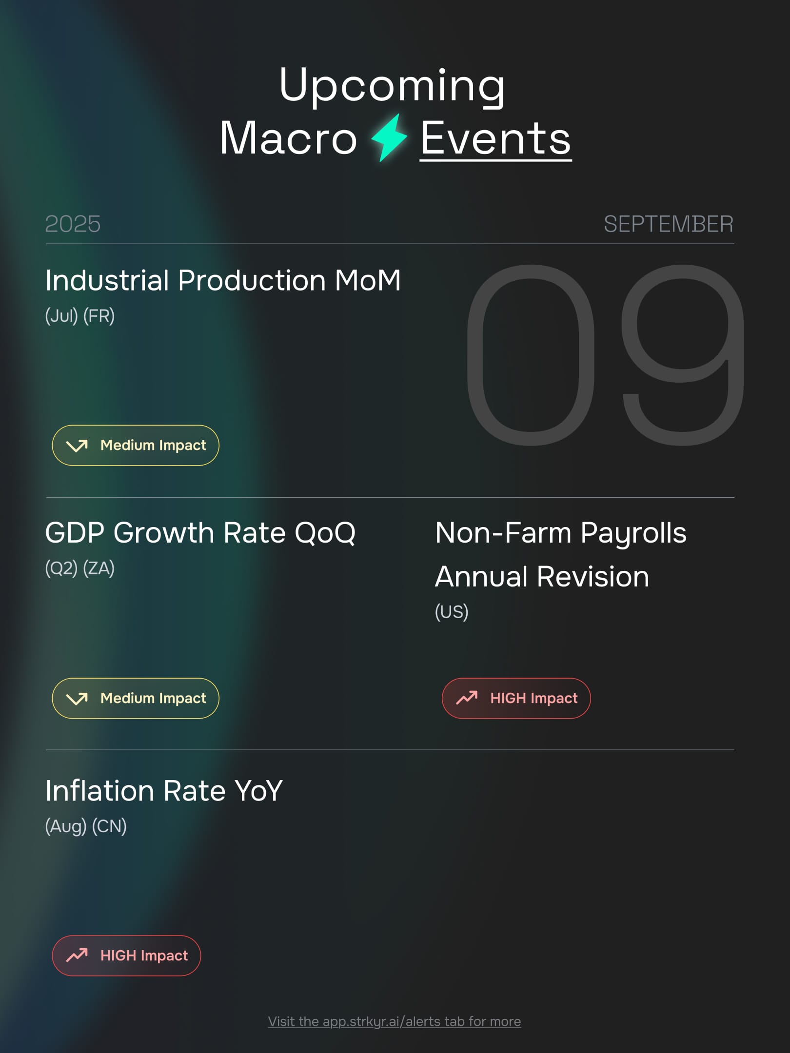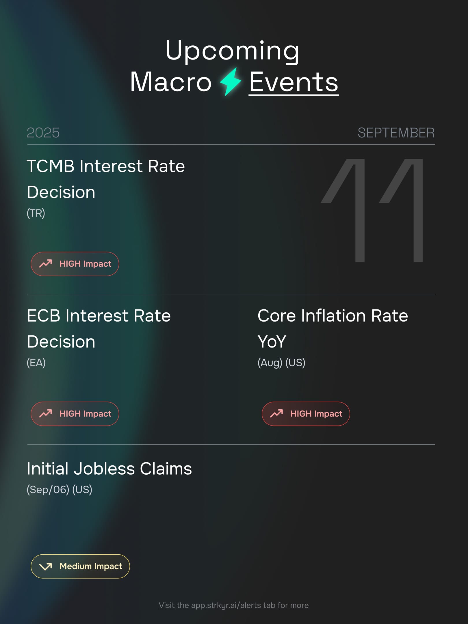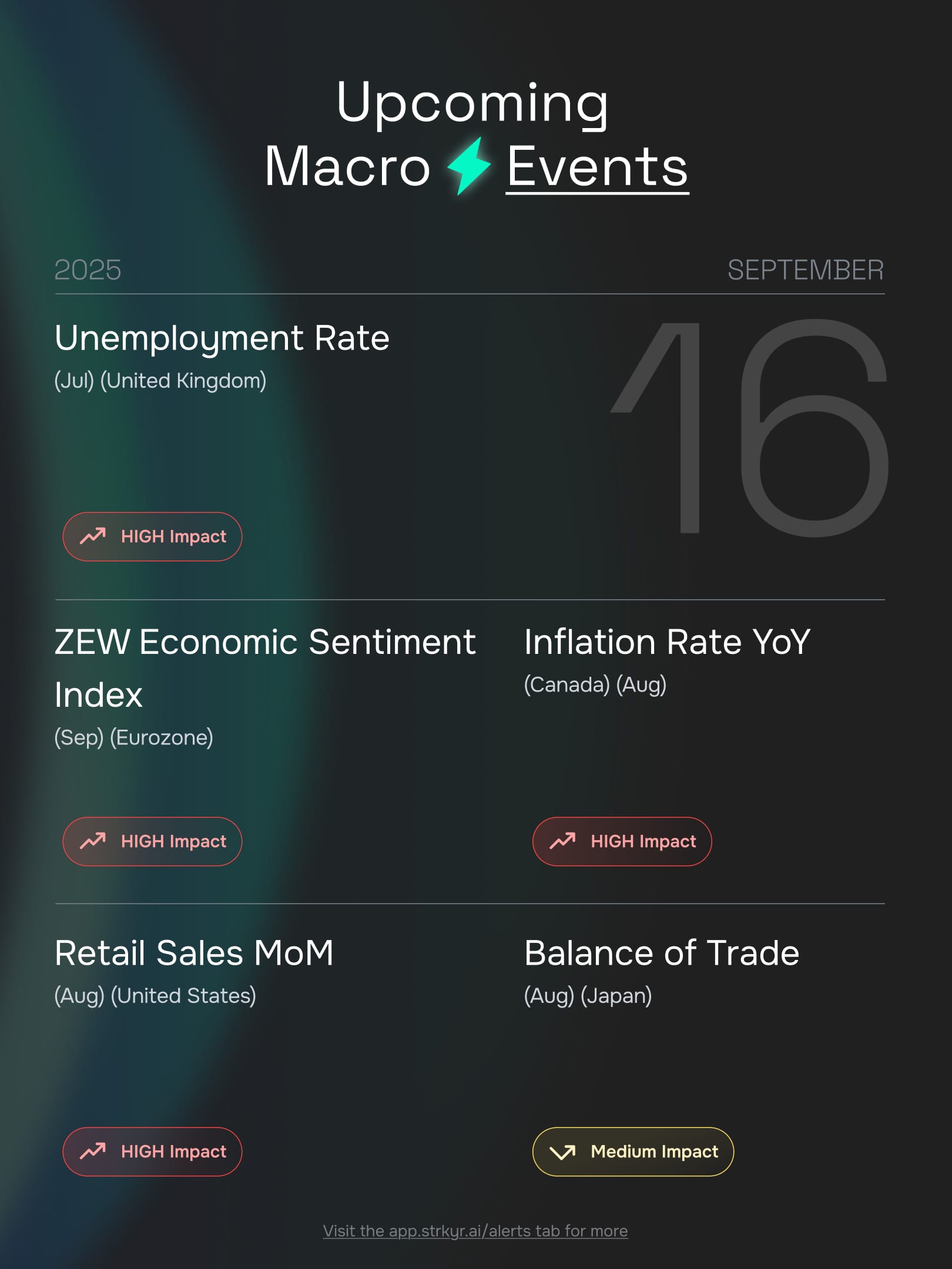 That wraps up Edition No. 2. Next week we’ll track fresh inflation data, central bank narratives, and how majors and alts position into the second half of September. Stay tuned, and thank you for reading Strykr.ai Weekly.