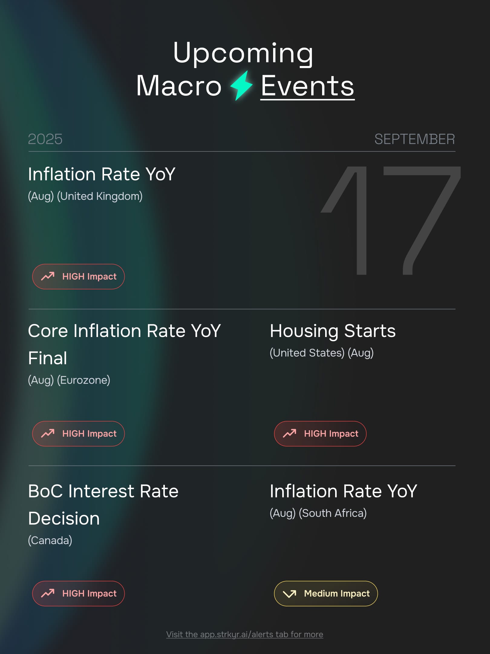 - Wednesday (Sept 17): A critical day for inflation watchers. UK and Eurozone CPI prints arrive alongside Canada’s BoC decision. Softer CPI paired with a steady BoC stance would support the case for looser global liquidity, while any stickiness could reintroduce volatility into FX and crypto.