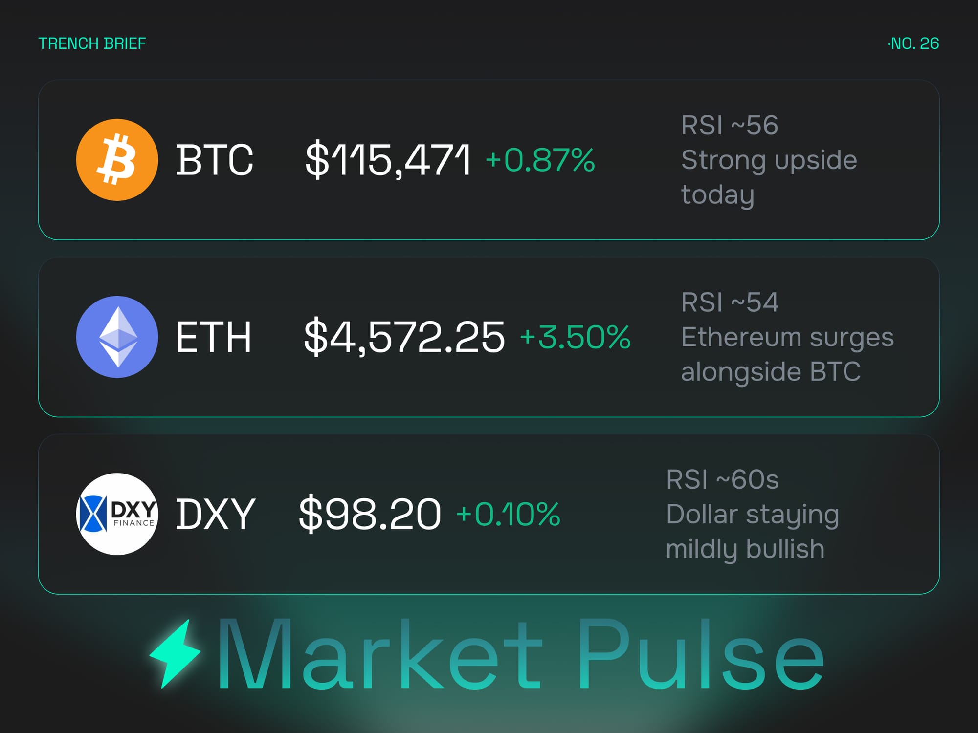 Markets pushed higher into the close of last week, with Bitcoin advancing to $115,471 (+0.87%) and holding RSI near 56, underscoring steady upside momentum. Ethereum outperformed, climbing to $4,572 (+3.50%) with RSI at 54, reinforcing its role as the market’s leading anchor. The U.S. dollar index (DXY) ticked up slightly to 98.20 with RSI in the 60s, keeping a mildly bullish tone but without disrupting crypto momentum.