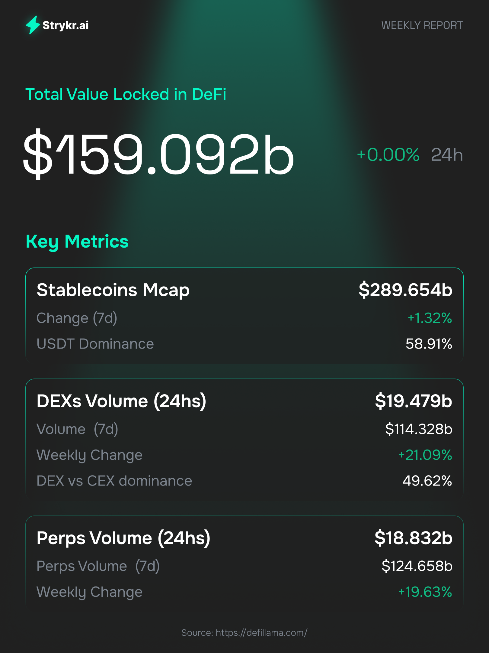 DeFi fundamentals stayed resilient. Total value locked held at $159.1B, with stablecoin supply climbing to $289.6B (+1.32%). USDT dominance remains near 59%, underscoring tether’s role as the sector’s anchor. DEX volumes rose to $19.5B daily (+21%), while perps surged to $18.8B (+19%).
