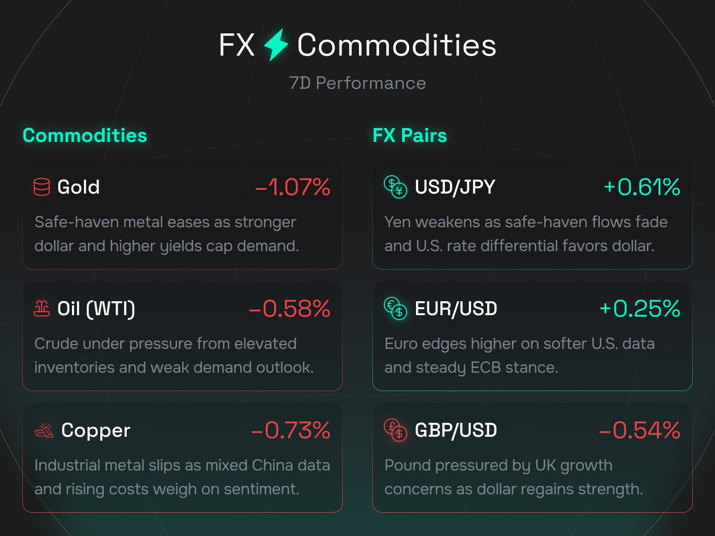 Cross asset flows underscored the broader risk tone. Gold slipped 1.07% as higher yields capped demand, while oil (-0.58%) and copper (-0.73%) both weakened on soft demand and mixed China data. Commodities are flashing a message of caution: growth jitters are still alive, and safe haven demand is not enough to offset stronger dollar conditions.