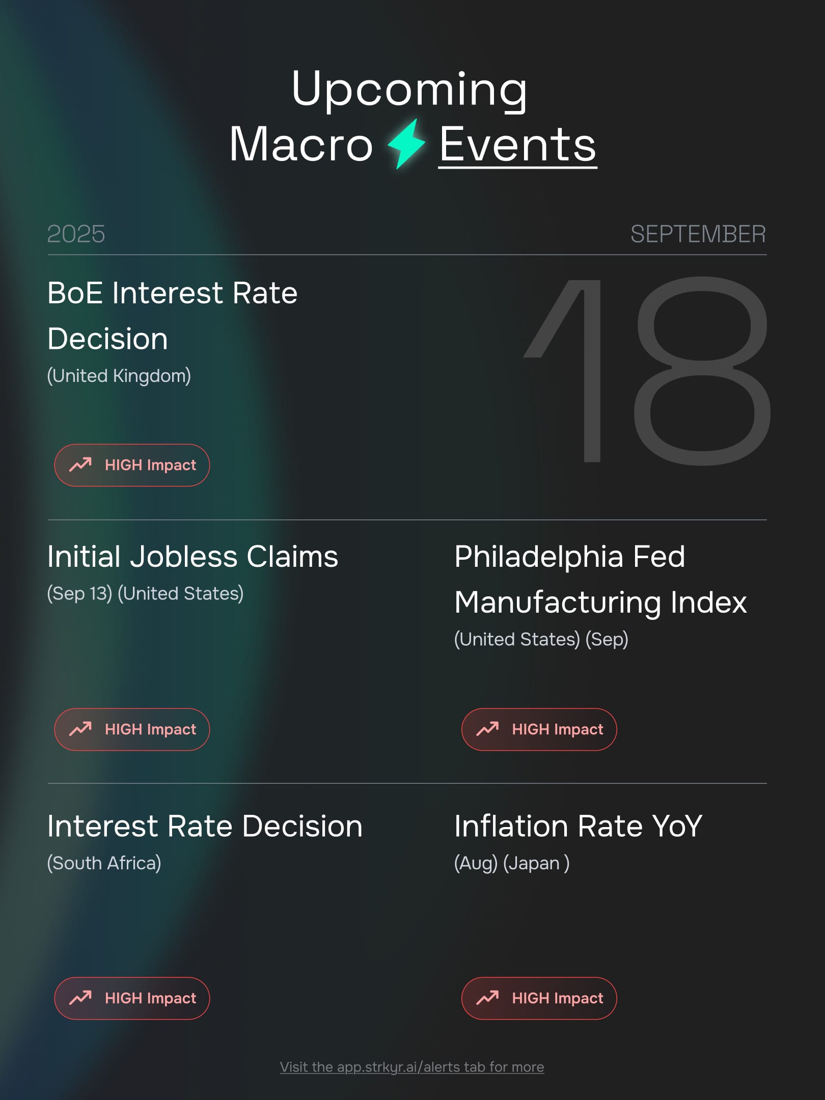 That wraps up Edition No. 3: Next week we will track US CPI, central bank decisions in the UK and Japan, and whether altcoin momentum can sustain into late September. Stay tuned, and thank you for reading Strykr.ai Weekly.