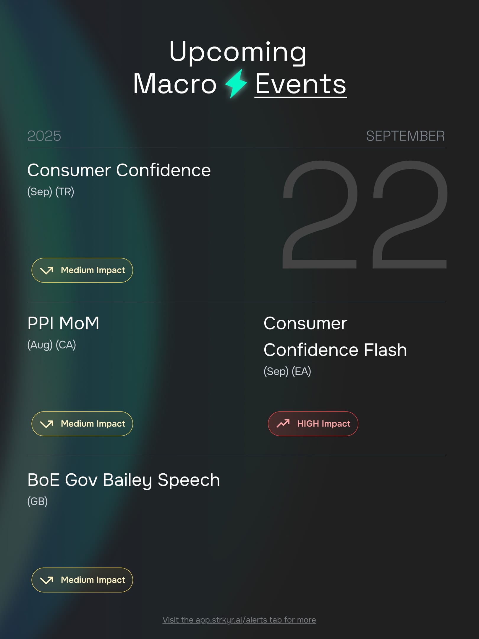 Monday (Sept 22): Consumer confidence numbers out of Turkey and Canada’s PPI kick things off, with both acting as early reads on inflation and sentiment. The Eurozone’s consumer confidence flash is the first high-impact event of the week, while BoE Governor Bailey’s speech may shape expectations for sterling heading into Thursday’s GDP and inflation focus.