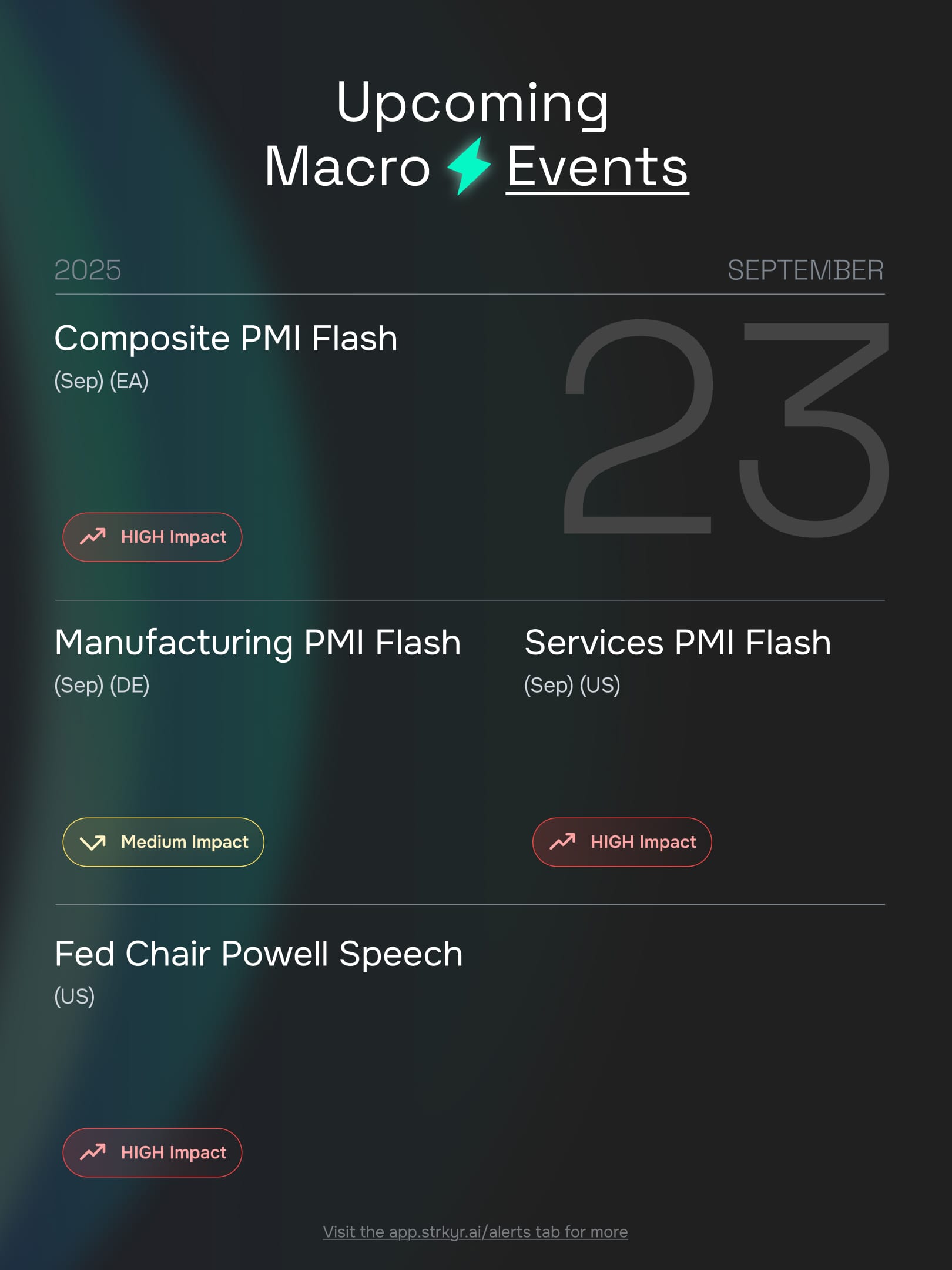 Tuesday (Sept 23): The data load intensifies with Eurozone composite PMI flash, U.S. services and manufacturing PMI, and Fed Chair Powell speaking. Any downside surprise in PMIs would amplify fears of a slowdown, while Powell’s tone will be scrutinized for how quickly the Fed is willing to lean into cuts. Together, this day has the potential to set the global risk tone for the rest of the week.