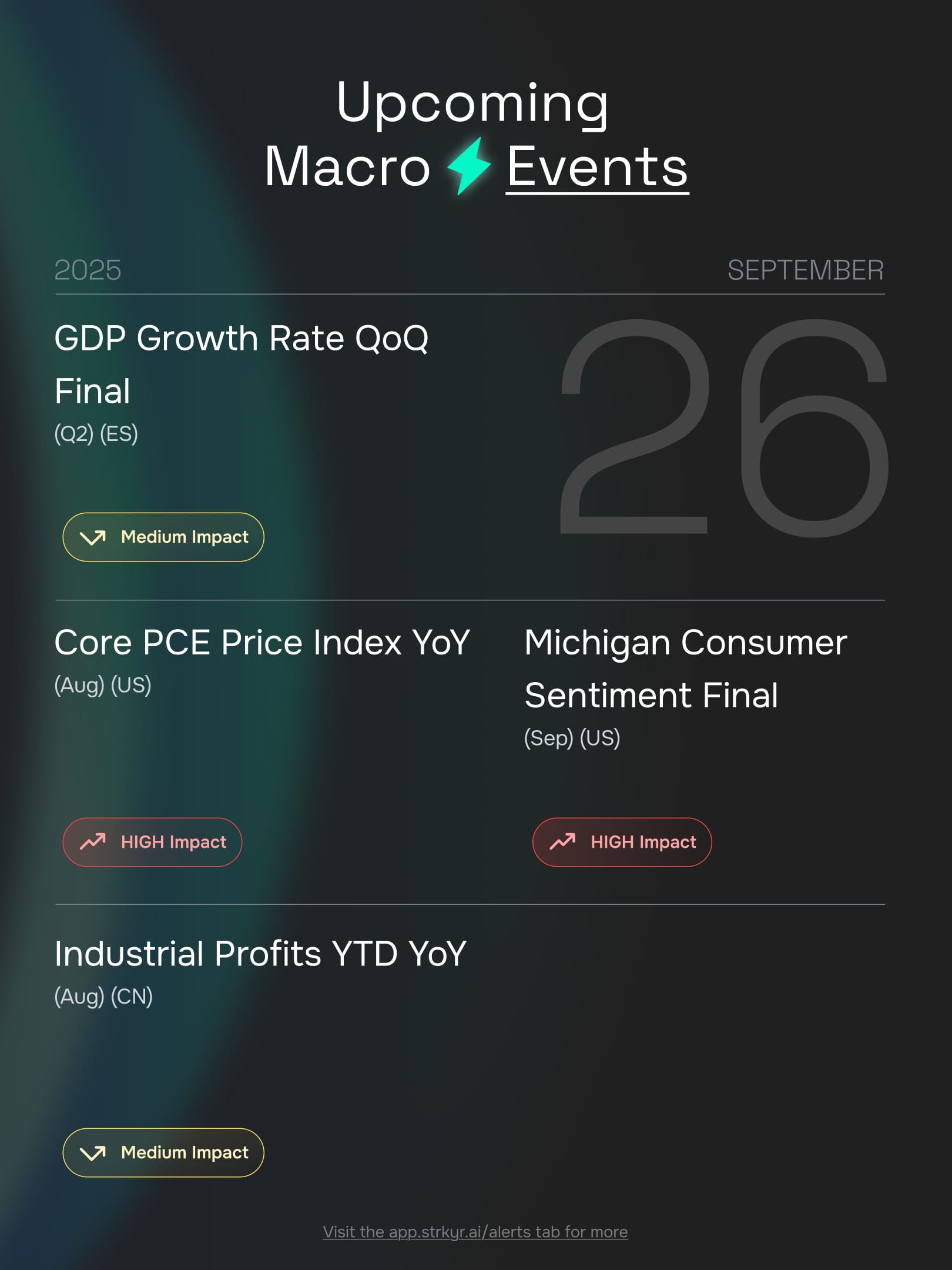Friday (Sept 26): A packed end to the week with U.S. core PCE, the Fed’s preferred inflation gauge, and the University of Michigan’s consumer sentiment final. Both are high-impact and will anchor the market narrative heading into October. China’s industrial profits release rounds out the week, providing another check on whether the world’s second-largest economy is stabilizing or still under pressure.