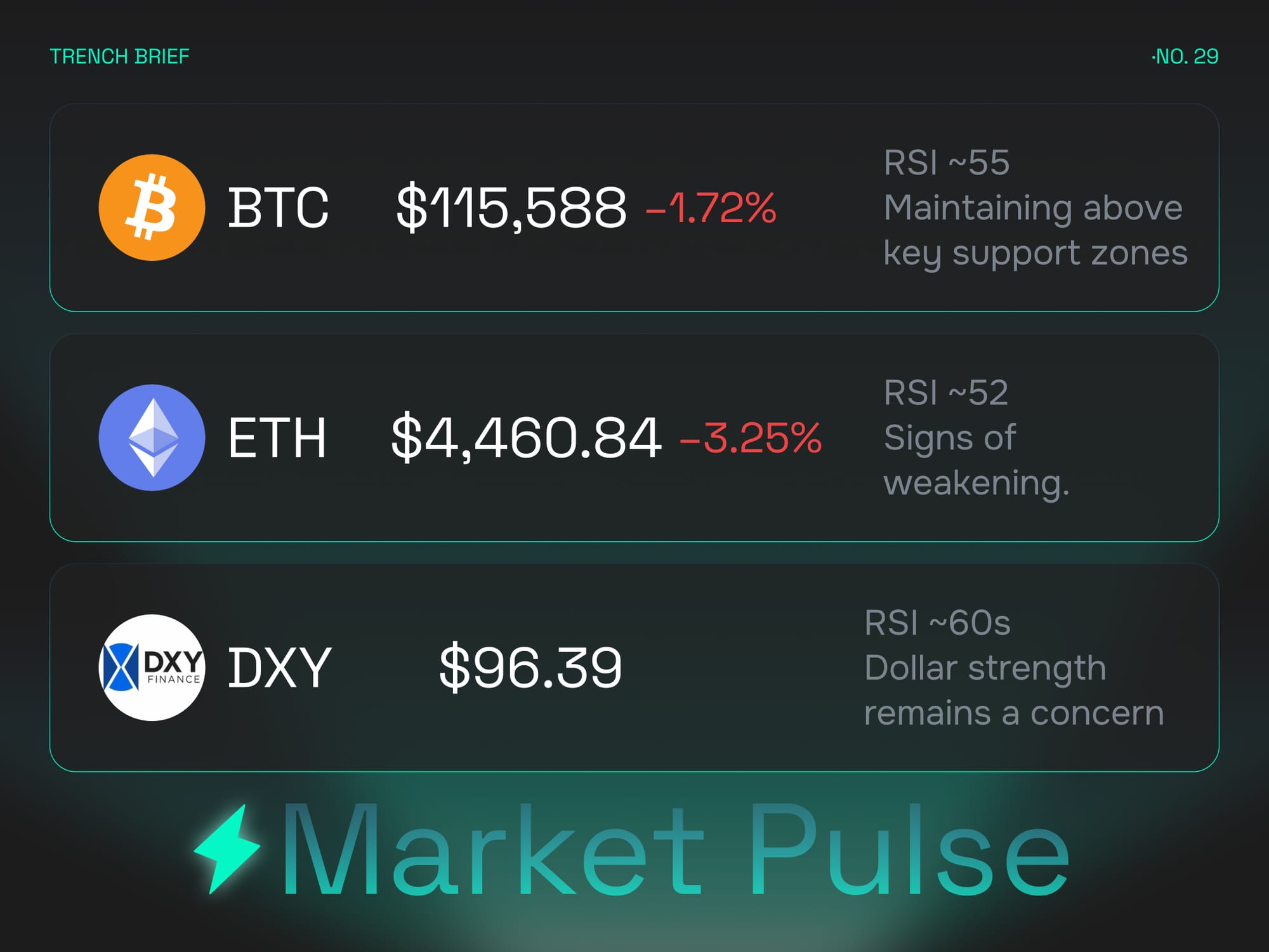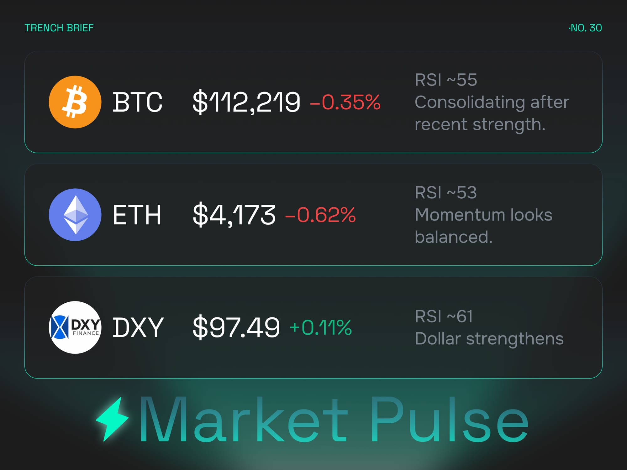 Markets are beginning the week in consolidation mode, with Bitcoin trading at $112,219 (-0.35%) and RSI near 55, holding ground after last week’s pullback. ETH slipped to $4,173 (-0.62%) with RSI around 53, reflecting balanced momentum as price action stabilizes at mid-range levels. The Dollar Index (DXY) edged up to 97.49 (+0.11%) with RSI at 61, underscoring continued dollar firmness and modest pressure across risk assets.