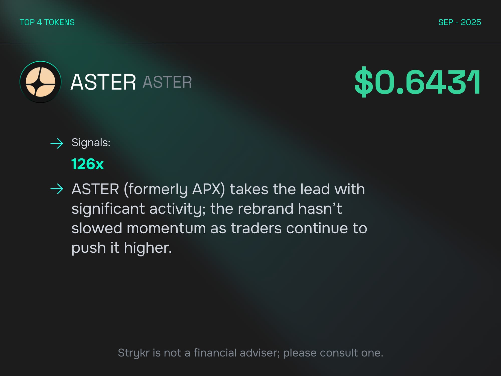 Aster (formerly APX) closed the week at $0.6431 with a commanding 126x signals, leading the field in activity. The rebrand has not slowed momentum; in fact, traders appear to be treating the transition as a catalyst rather than a hurdle. Sustained demand and strong turnover suggest Aster is maturing into more than just a speculative rebound story. Its consistency across multiple sessions points to deeper participation, with both retail traders and larger desks rotating in. For now, Aster is positioning itself as a mid-cap bellwether, capturing liquidity in a way that mirrors how prior cycles produced standout tokens early in their rebrand phases.