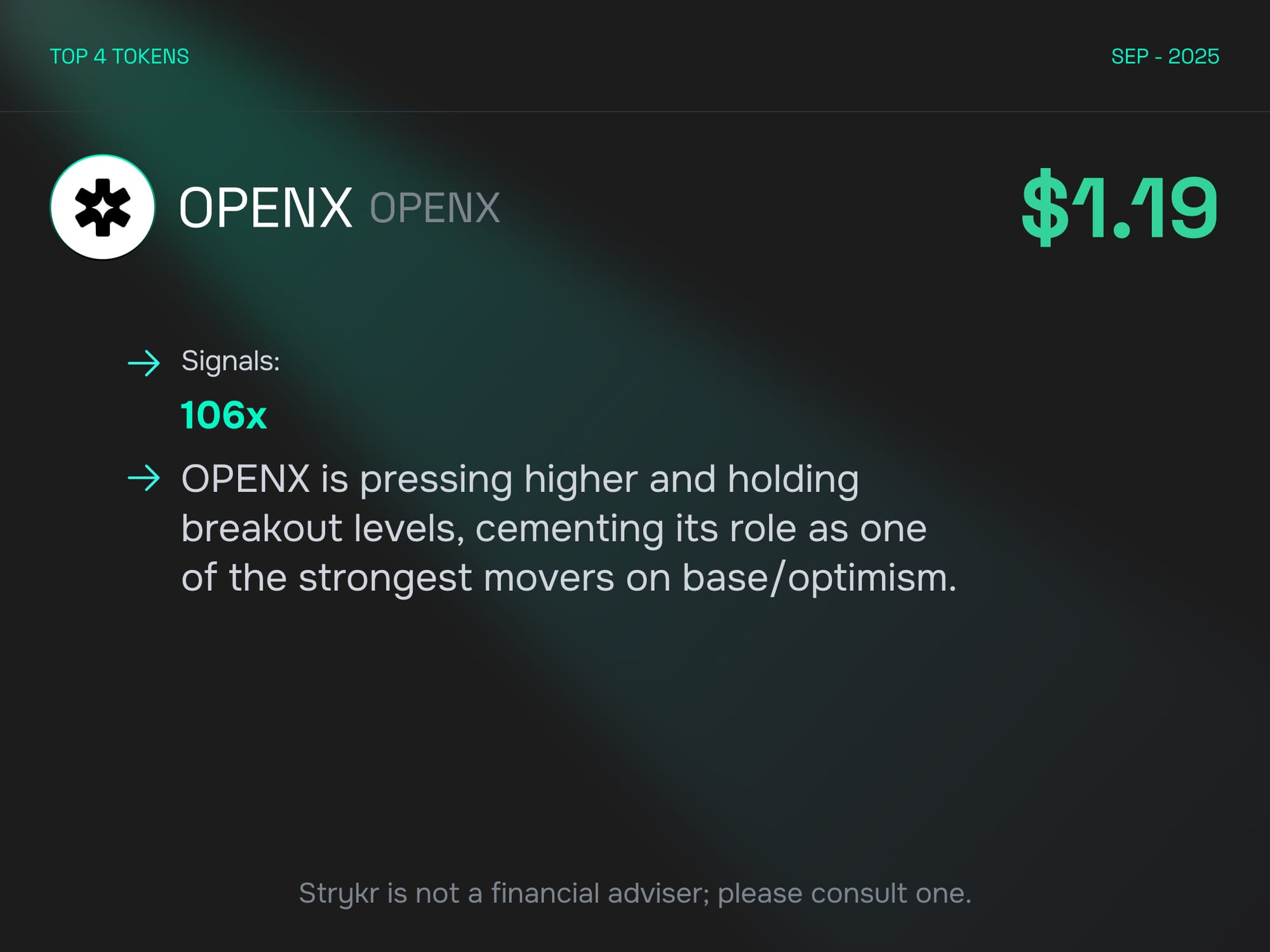 OpenX advanced to $1.19 with 106x signals, pressing higher and consolidating breakout levels on Base/Optimism. This performance reflects both its technical strength and the structural bid behind activity on L2 ecosystems. OpenX has begun to separate itself from one-off speculative names, showing the ability to hold gains even as broader sentiment cooled. The strong signal activity underscores robust turnover, while steady price action points to disciplined participation. OpenX remains one of the cleanest breakout trades in the market, and as long as Base/Optimism flows continue, it is well positioned to capture sustained attention.