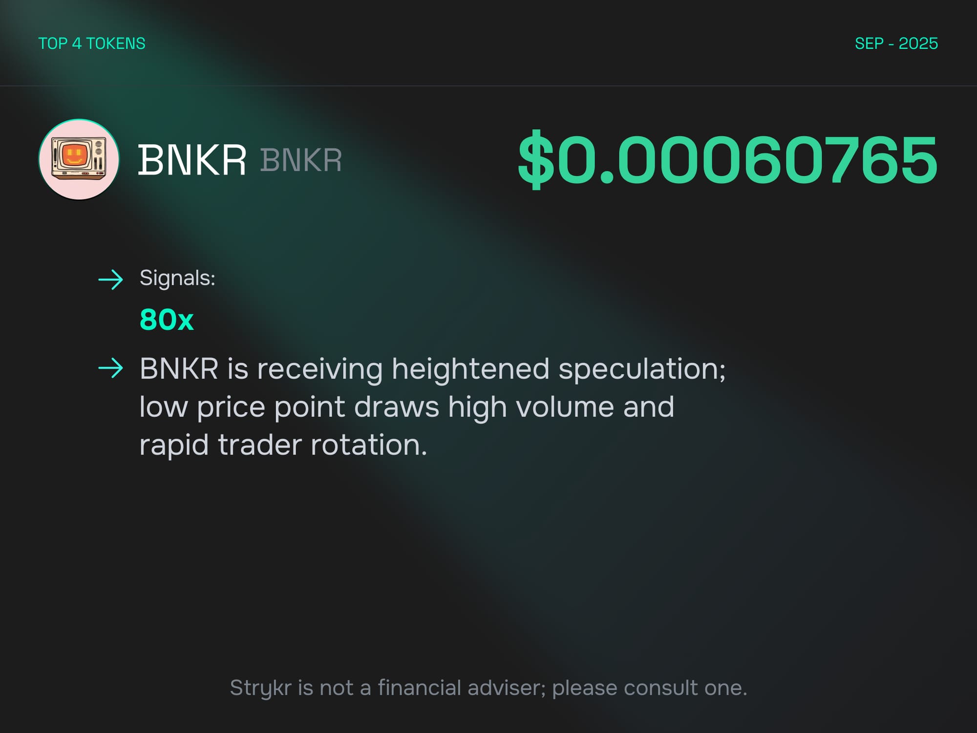 BNKR ended the week at $0.00060765 with 80x signals, once again proving its appeal as a high-volume rotation token. Its extremely low price point creates a natural draw for speculative traders, who cycle in and out quickly, driving rapid liquidity churn. The heightened signal activity confirms that BNKR continues to attract significant traffic despite its microcap profile. While its valuation remains modest, its liquidity velocity makes it one of the most tradable tokens in the current market. BNKR thrives in weeks of indecision, when traders seek quick, tactical exposure, and last week’s activity reinforced that dynamic.