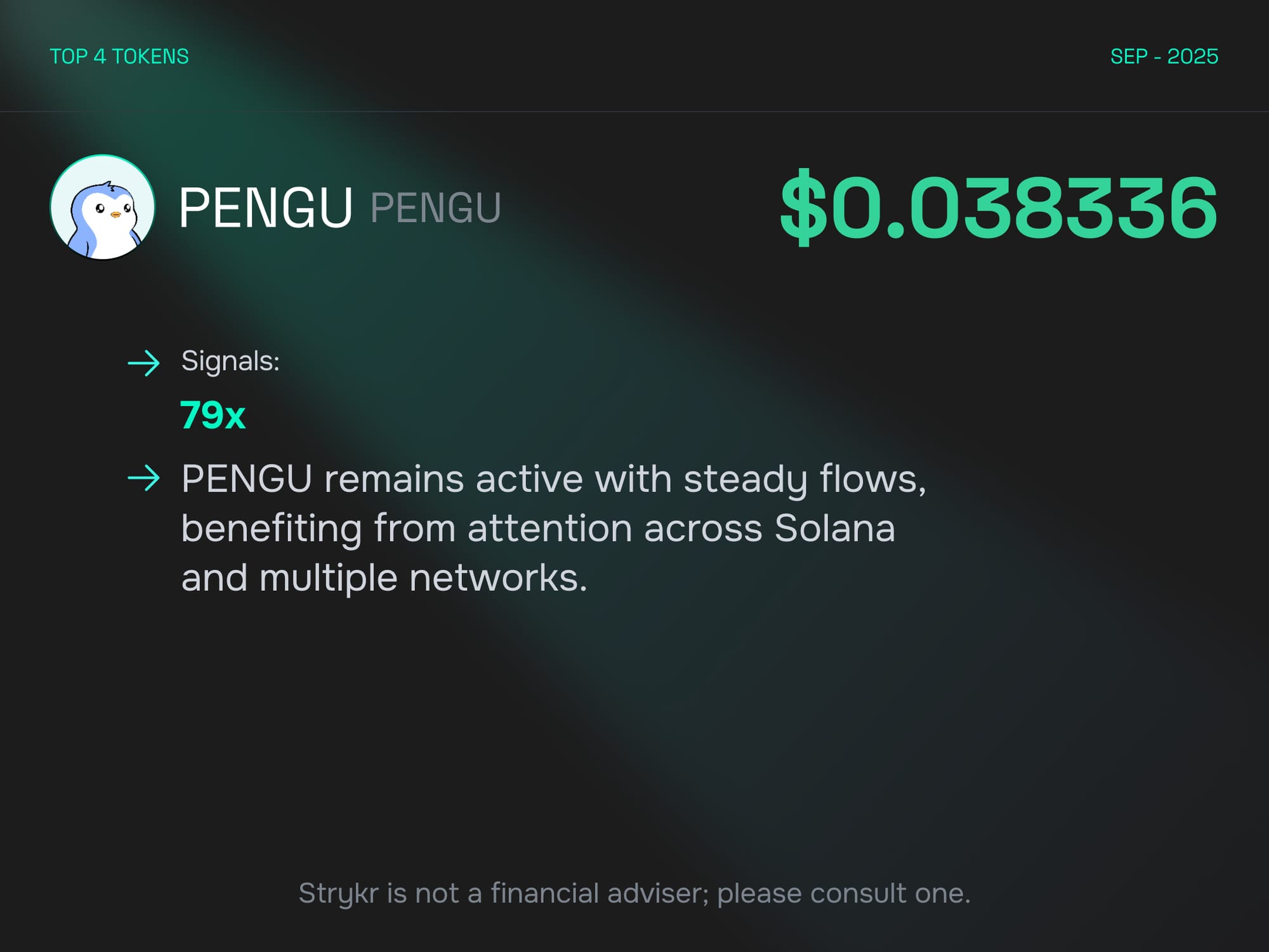 PENGU traded at $0.0383 with 79x signals, maintaining steady flows across Solana and other networks. Its ability to sustain relevance across ecosystems sets it apart from many peers in the small-cap space. Traders continue to gravitate toward PENGU for its combination of meme-driven visibility and multi-chain engagement. While not the week’s most explosive mover, its stability reflects a loyal base and consistent turnover. For traders looking for exposure to Solana narratives without chasing extreme volatility, PENGU remains a go-to option. Its staying power confirms that it is more than a passing fad, even as broader market conditions ebb and flow.