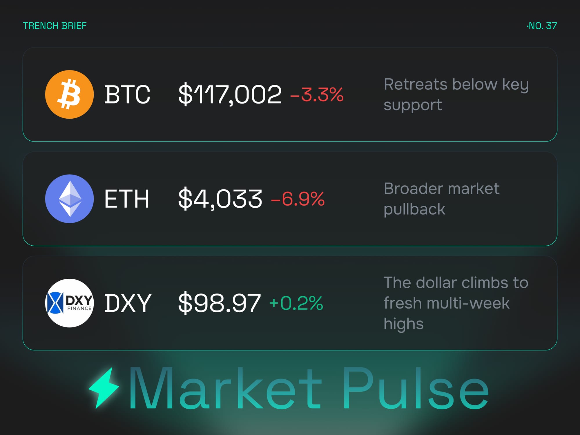 The second week of October turned defensive, with BTC slipping 3.3% to $117,002 after failing to hold support near 120K. ETH led the pullback, sliding 6.9% to $4,033 as profit-taking hit key liquidity zones. Meanwhile, the Dollar Index (DXY) climbed modestly to 98.97 (+0.2%), pressing to multi-week highs and keeping pressure on broader risk sentiment.