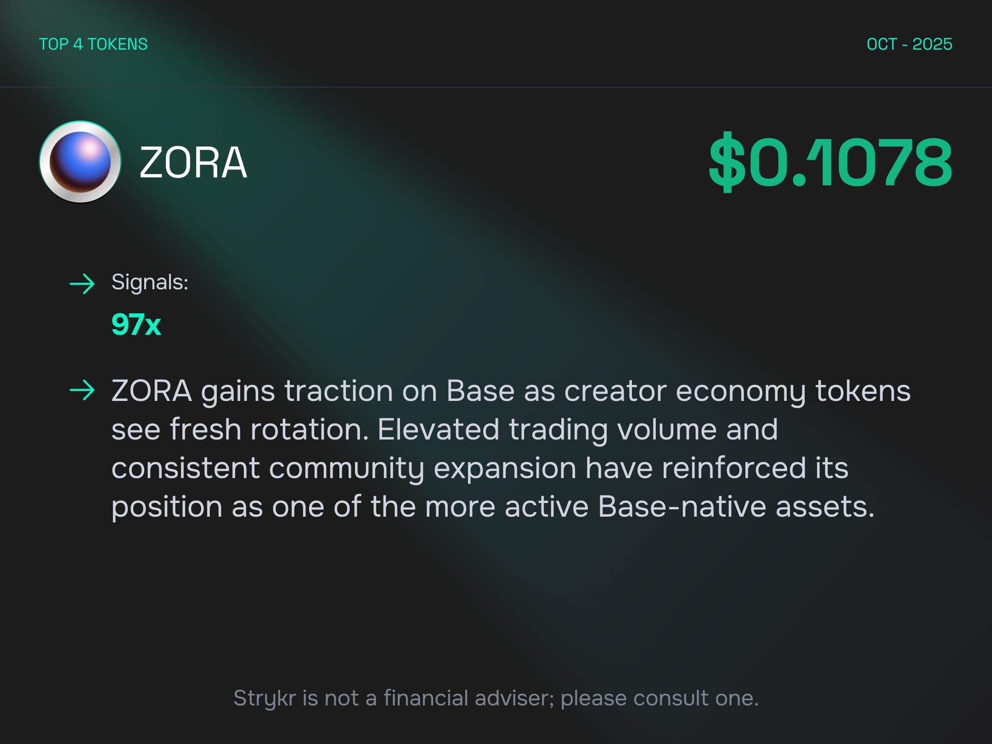 ZORA gained strong traction last week as activity around Base-native creator economy tokens accelerated. Elevated trading volumes and consistent signal flow reflected growing engagement from both builders and collectors. Liquidity held steady across decentralized venues, underscoring that participation is expanding beyond short bursts of speculation. With its blend of cultural and technical utility, ZORA continues to position itself as one of the more enduring projects in the Base ecosystem.
