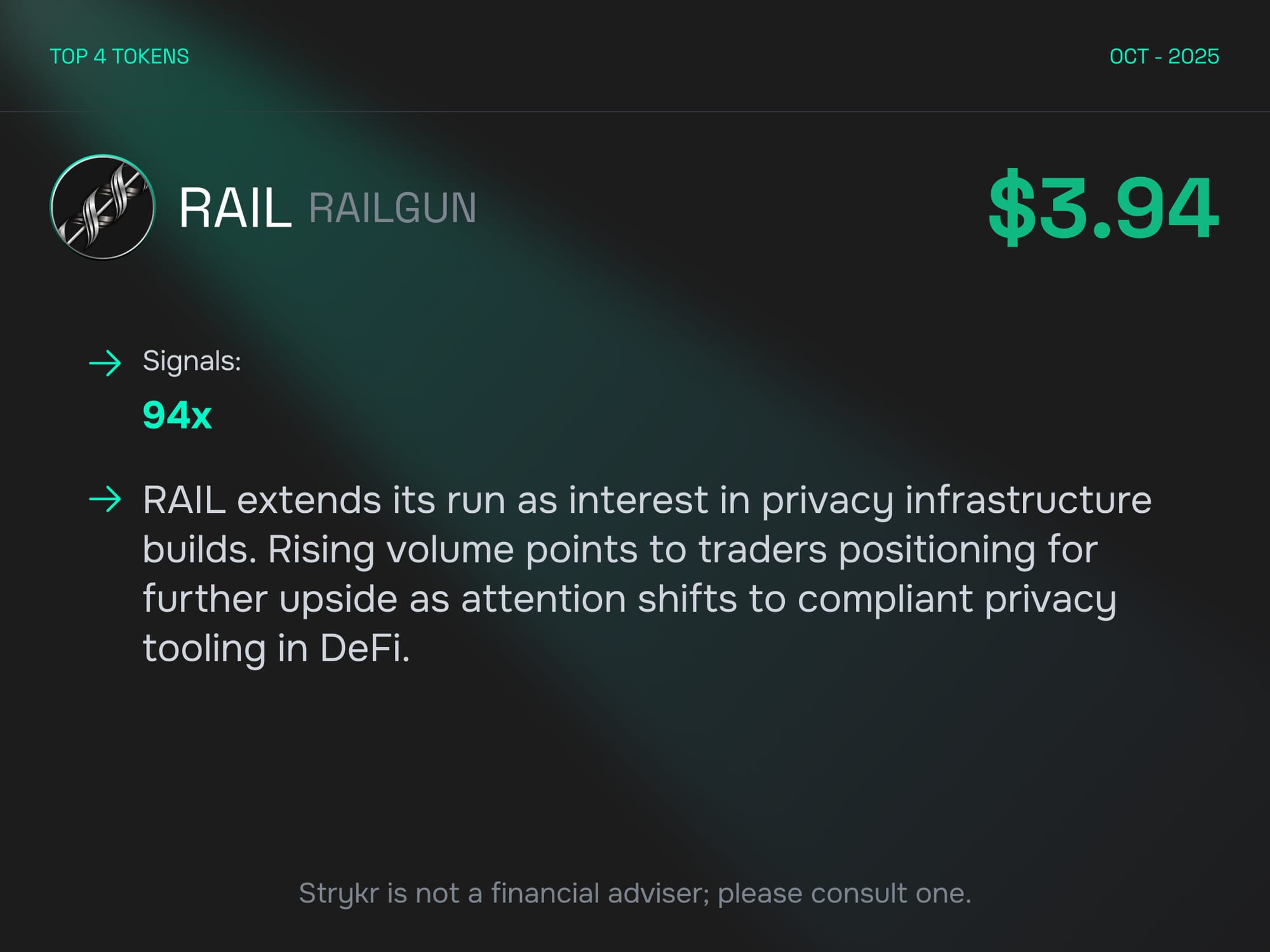 RAIL extended its move higher as traders continued to accumulate exposure to privacy infrastructure plays. Signal activity stayed elevated, highlighting consistent positioning among both discretionary and algorithmic participants. Despite broader market consolidation, RAIL’s structure remained clean, supported by rising volume and tightening spreads. The sustained flow points to an ongoing revaluation of privacy protocols as regulatory clarity and compliance-focused development gain momentum.