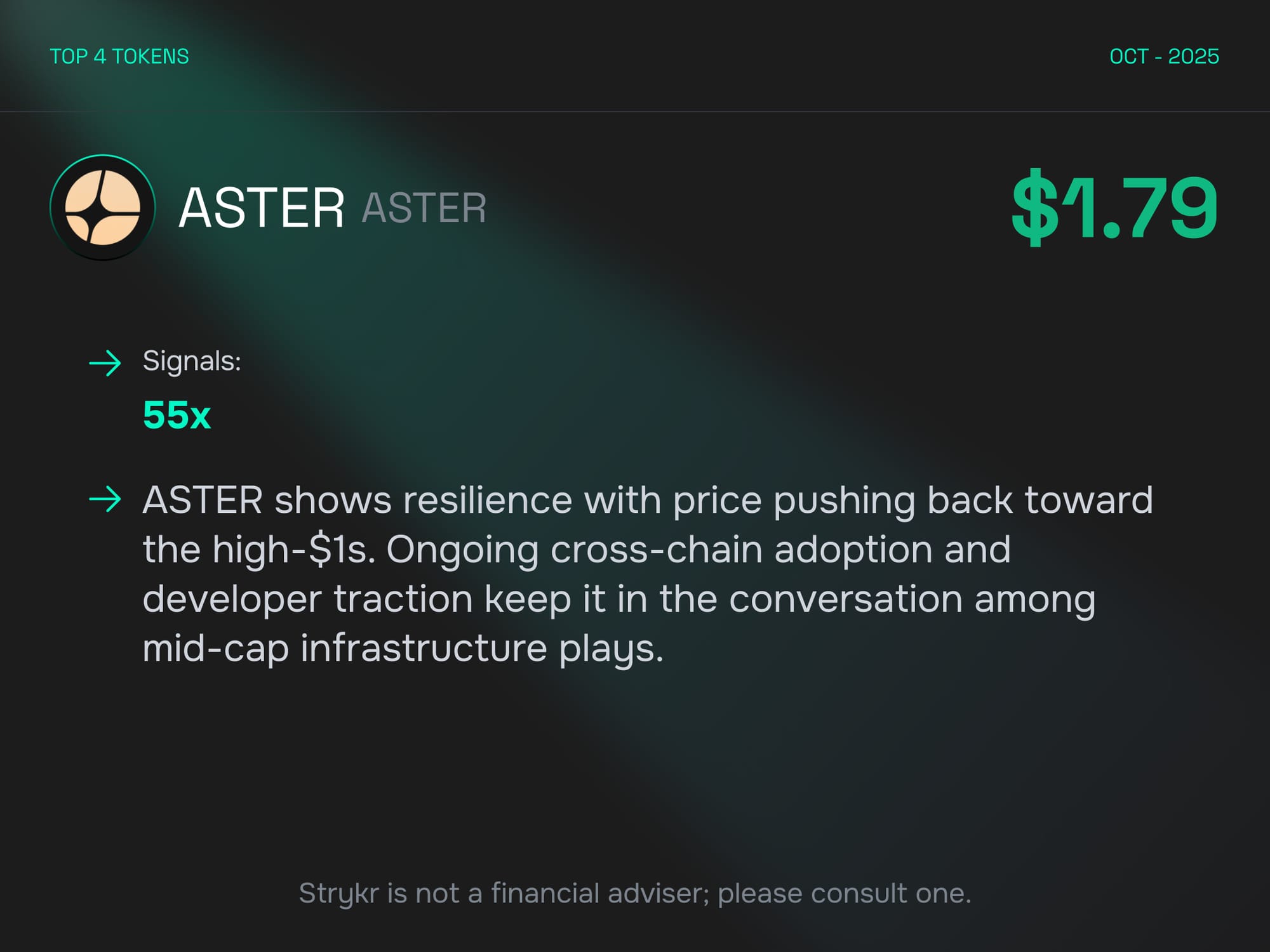 ASTER maintained its reputation for resilience, holding firm through rotation and renewed volatility across mid-caps. Signal intensity reflected steady demand, and price structure continued to tighten near recent highs. Liquidity across exchanges remained stable, with cross-chain integrations and developer traction supporting a broader narrative of structural strength. As capital searches for quality within the mid-cap range, ASTER remains a reference point for consistency and execution.