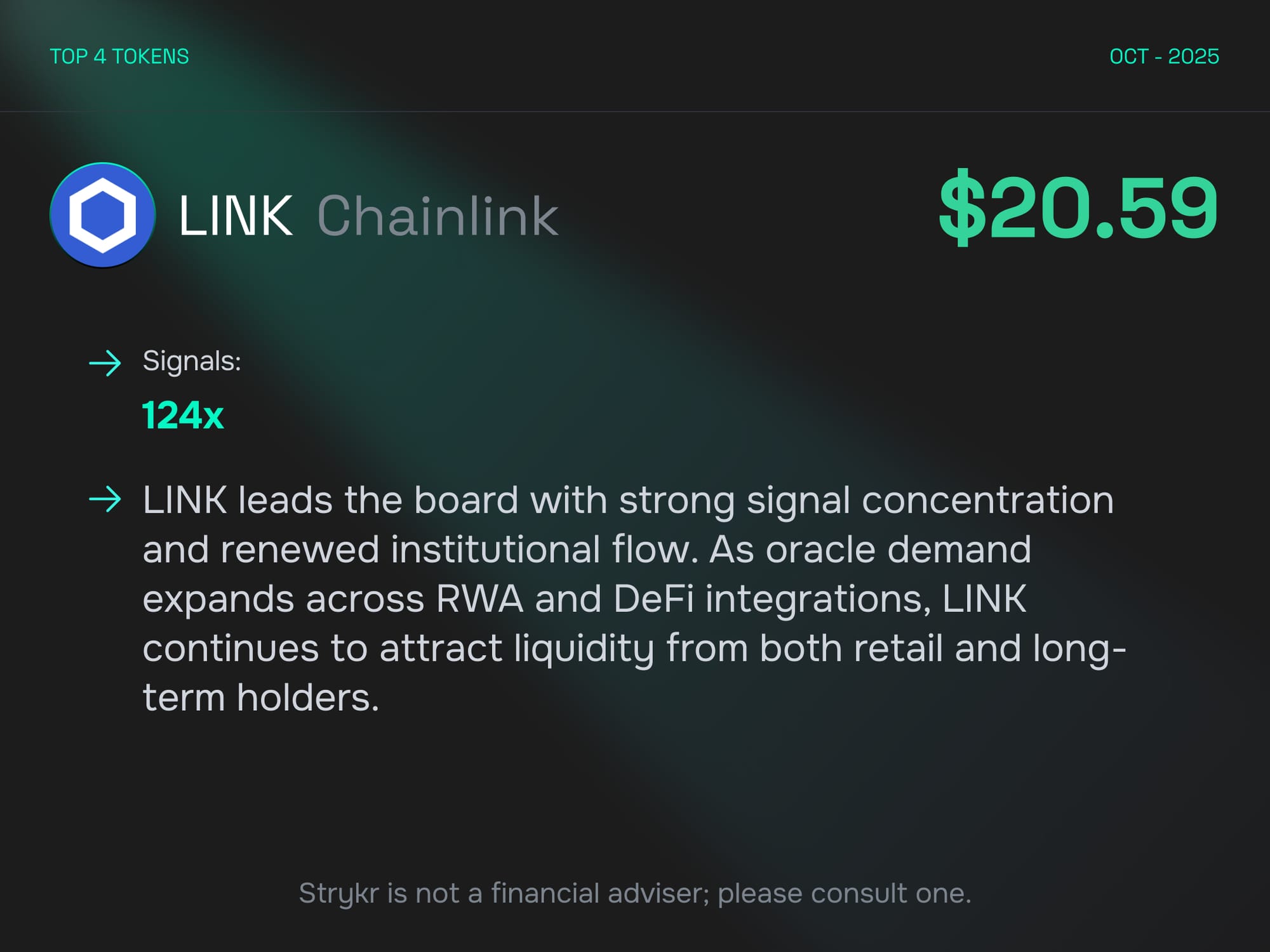 LINK once again led the board, cementing its position as the anchor for institutional and DeFi-related flows. Signal concentration rose meaningfully as traders re-engaged with oracle infrastructure following renewed real-world asset discussions. Liquidity remained deep across both centralized and decentralized venues, allowing LINK to sustain its leadership without excess volatility. The token’s strong bid presence highlights its continued role as a liquidity benchmark for higher-cap assets.