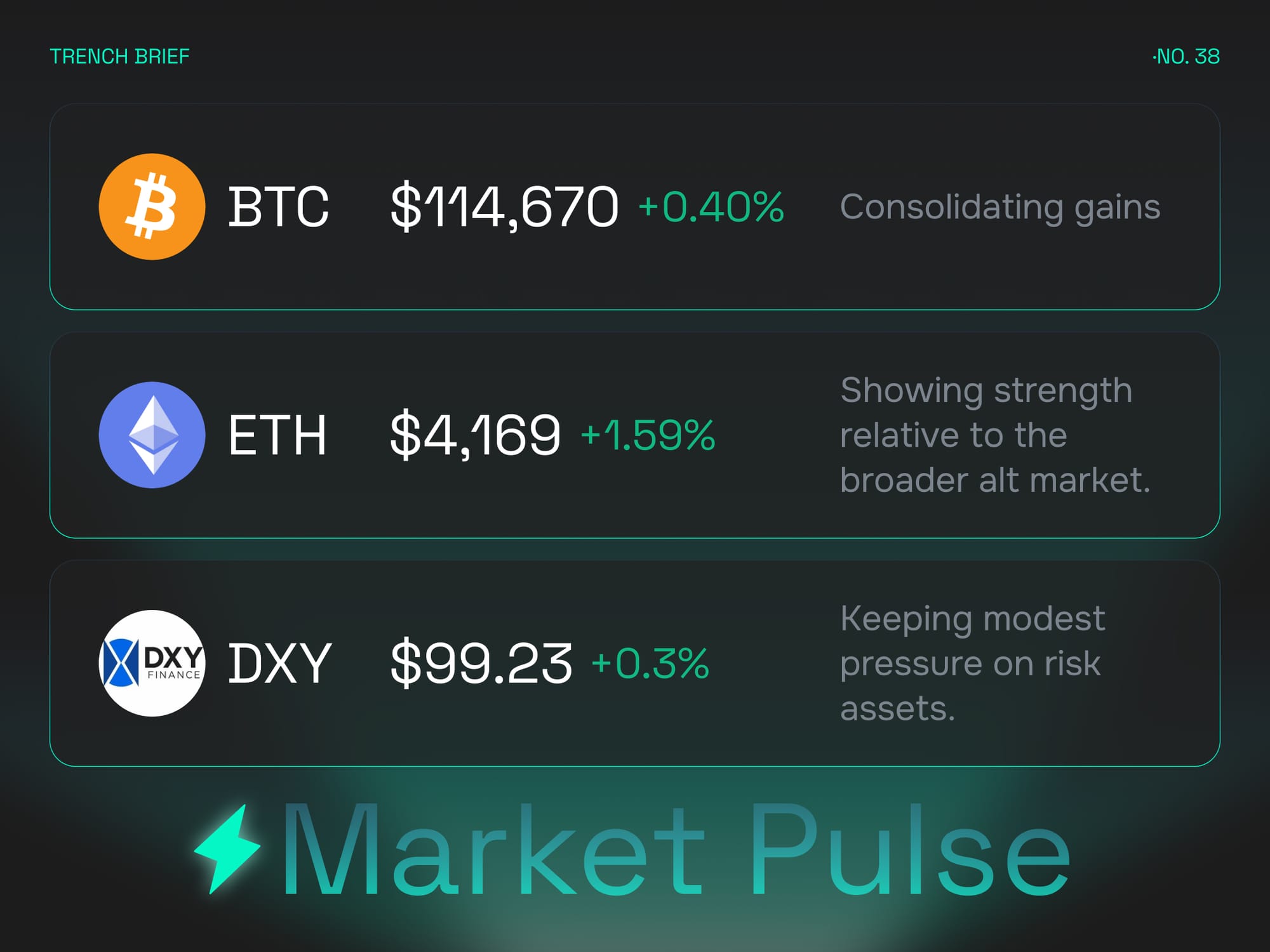 Markets are starting the week with steady footing, showing renewed resilience after last week’s consolidation. Bitcoin is trading around $114,670 (+0.40%), stabilizing as buyers absorb supply near support. Ethereum has climbed to $4,169 (+1.59%), outperforming broader alt markets and maintaining consistent dip demand. The Dollar Index (DXY) sits at $99.23 (+0.3%), keeping modest pressure on risk assets but not reversing sentiment.