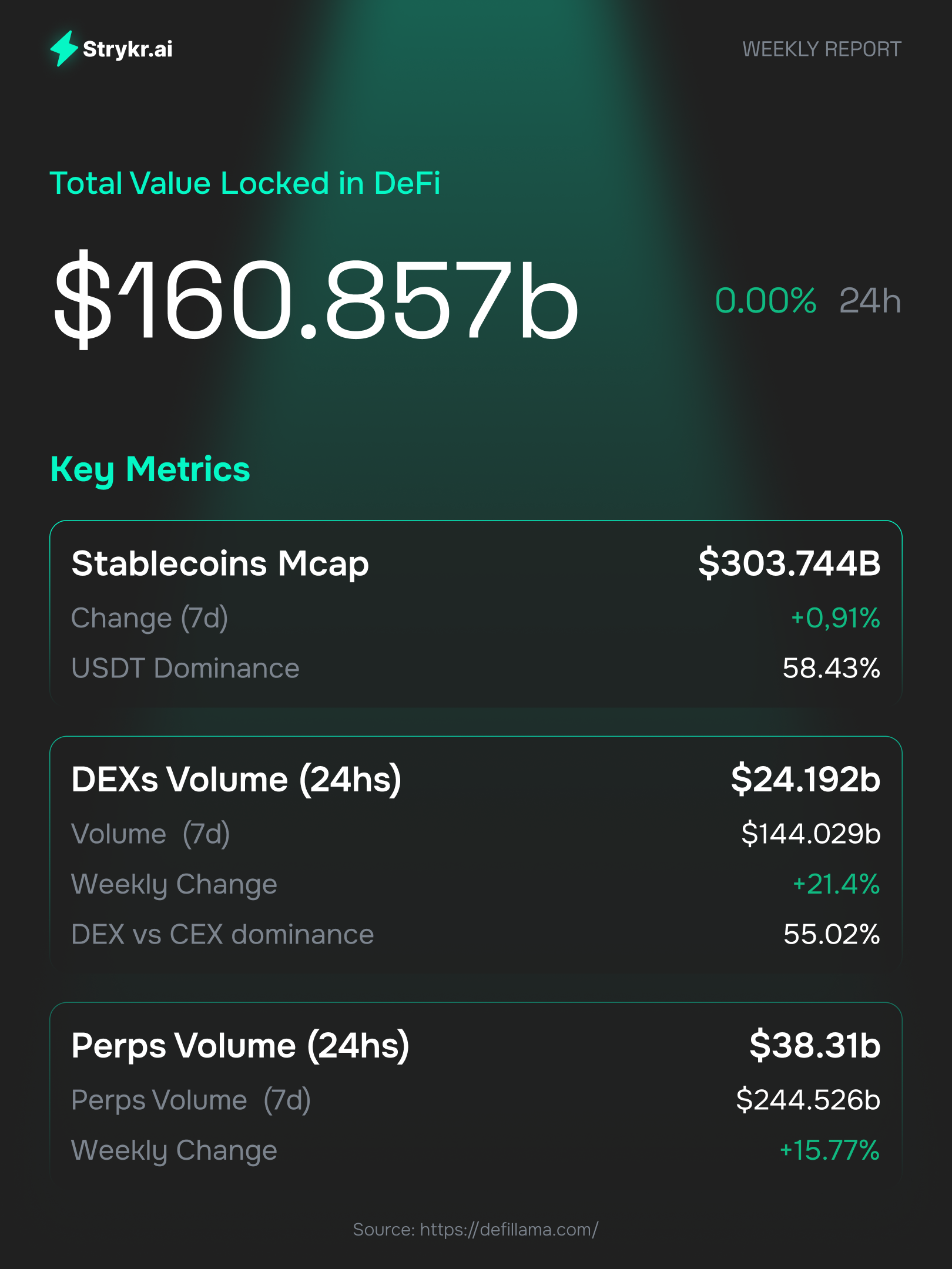 DeFi metrics held steady last week as liquidity and participation remained resilient. Total value locked came in at $160.86B, marking a stable reading after recent inflows across key ecosystems. The stablecoin market cap rose to $303.74B, up 0.91%, with USDT holding dominance near 58.43%.