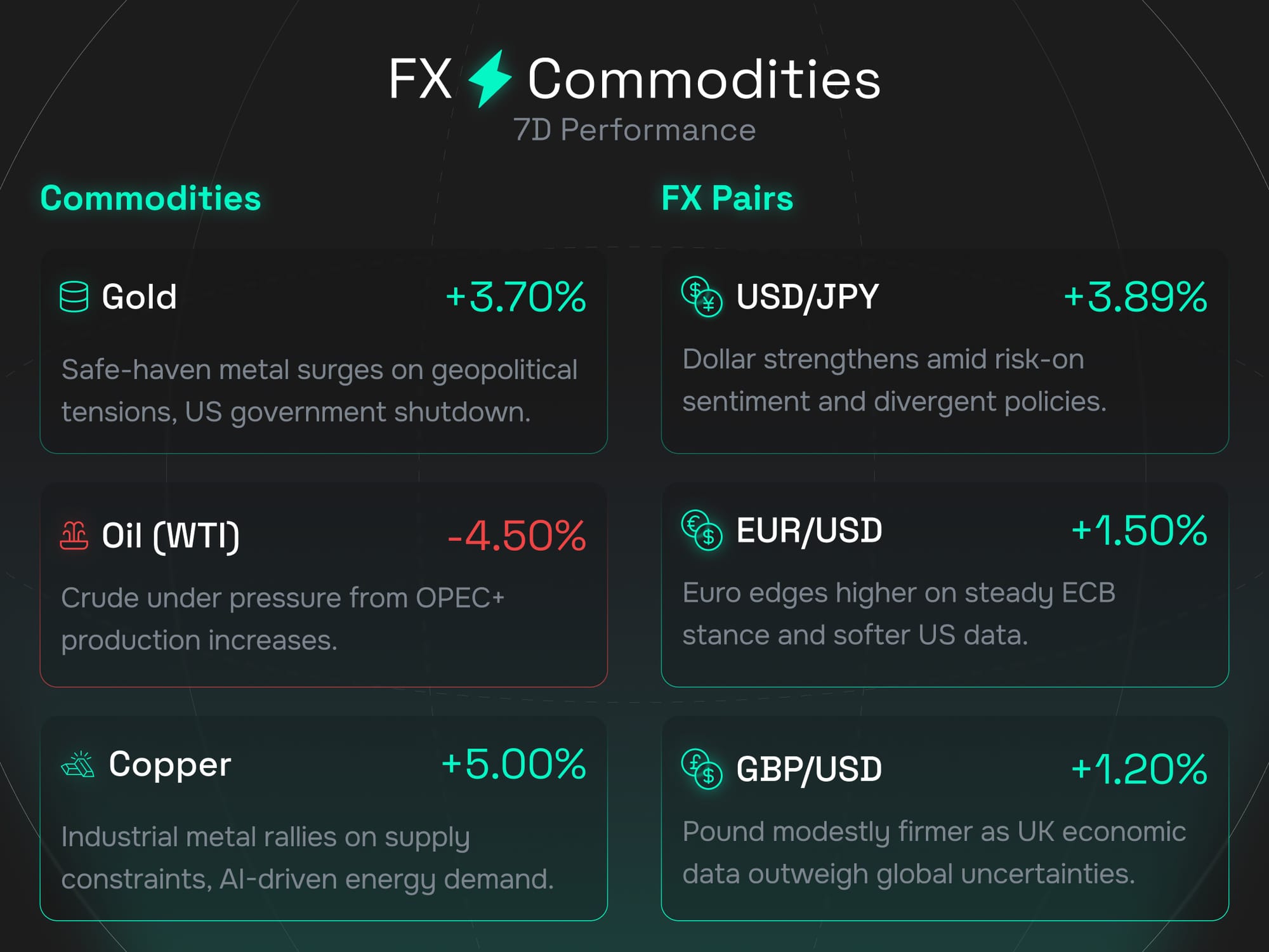 Cross-asset flows last week reflected cautious positioning as traders balanced geopolitical risks with shifting rate expectations. Gold surged 3.7%, benefiting from safe-haven demand tied to global tensions and renewed concerns over a potential US government shutdown. Oil (WTI) fell 4.5% as OPEC+ supply signals pressured sentiment and offset seasonal demand optimism. Copper gained 5.0%, rallying on tightening supply and AI-linked industrial energy demand.