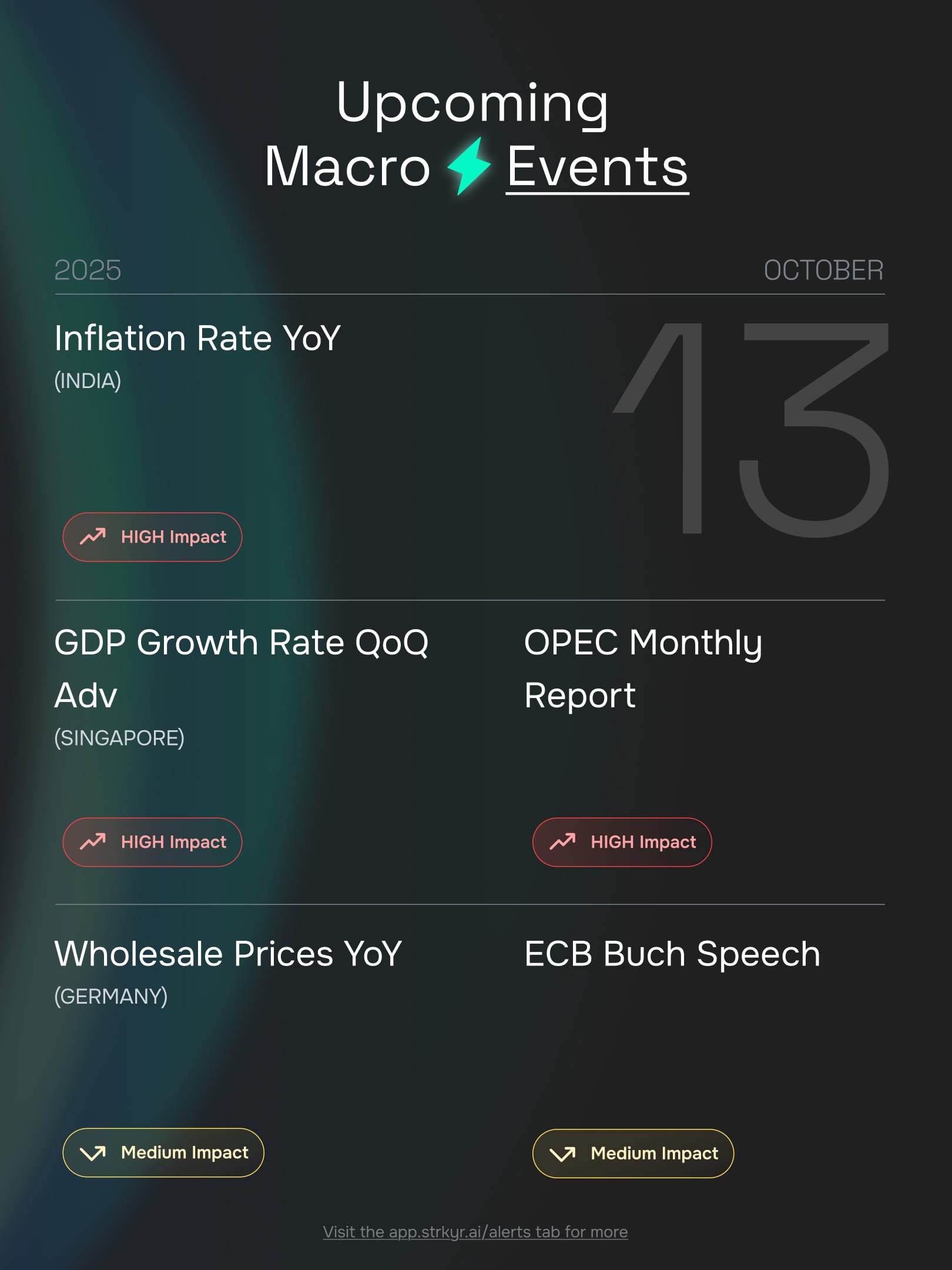 Monday (Oct 13): Focus centers on India’s inflation rate, Singapore’s GDP growth, and the OPEC monthly report. Together, these will gauge regional demand trends and set the tone for commodities and emerging market flows.