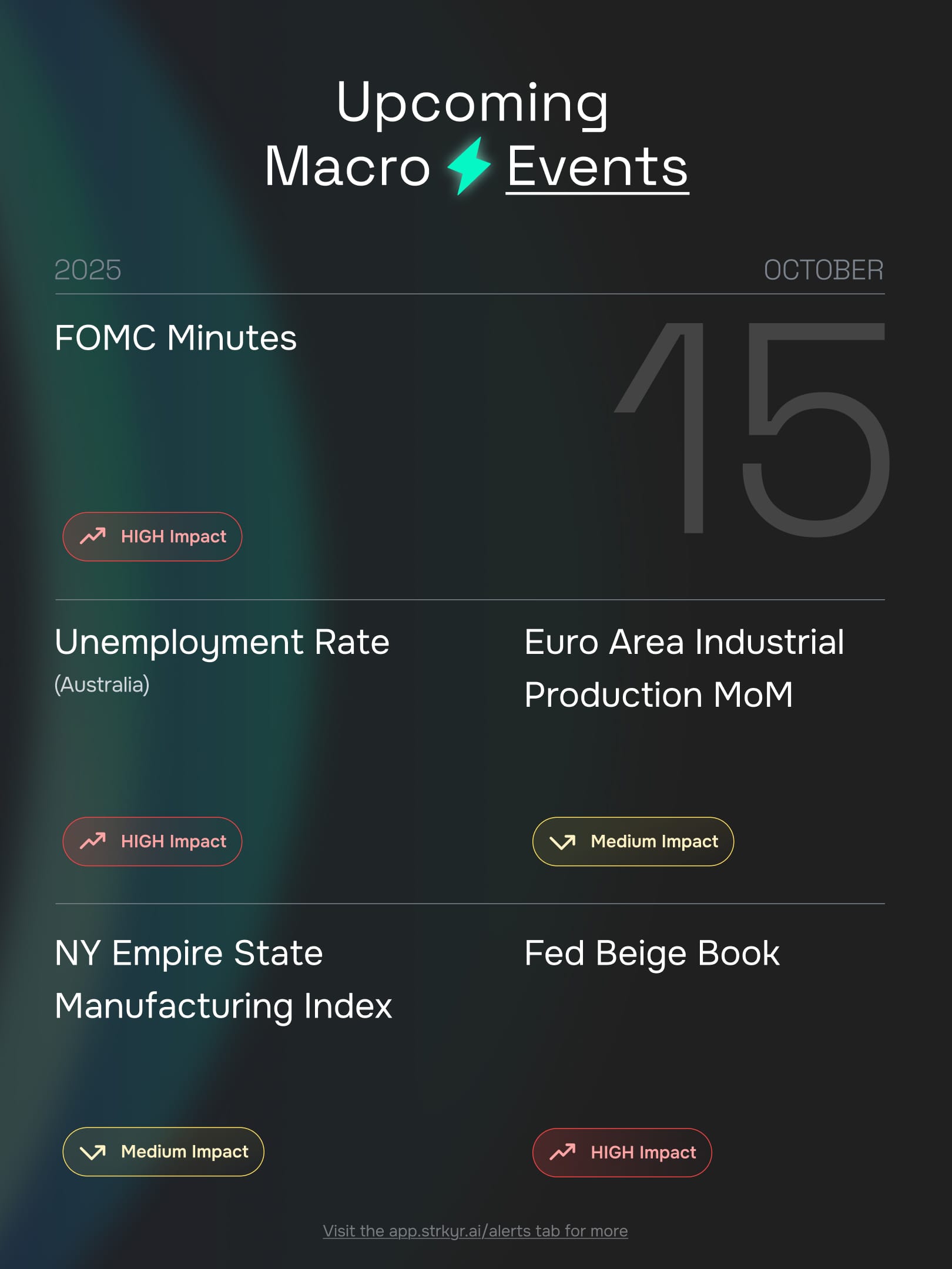 Wednesday (Oct 15): The FOMC Minutes headline the session, providing clarity on the Fed’s internal rate debate. Australia’s unemployment print and Europe’s industrial production data round out a day rich in global labor and manufacturing signals.