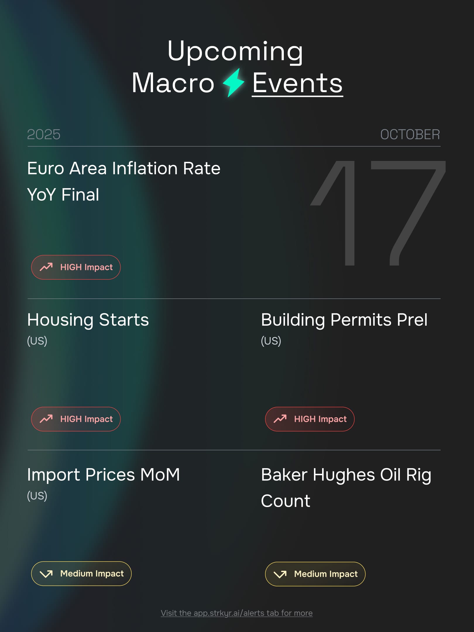 Friday (Oct 17): The Euro Area’s final inflation reading closes the week, accompanied by US housing and import data. Together they offer the last key inputs before markets reassess risk appetite heading into the second half of October.